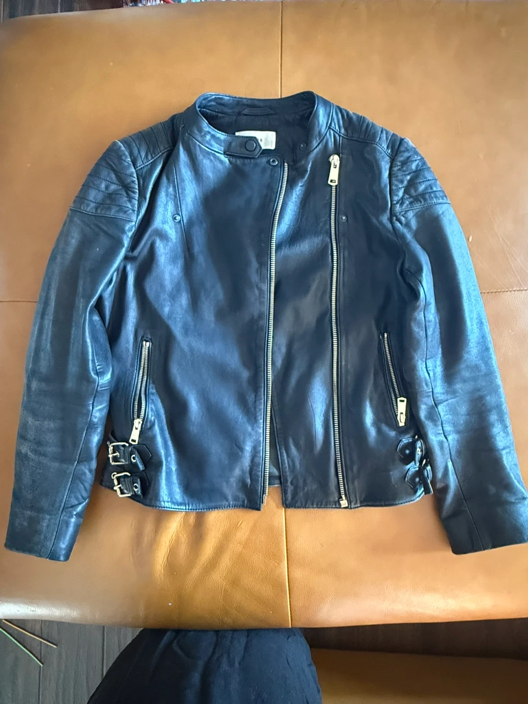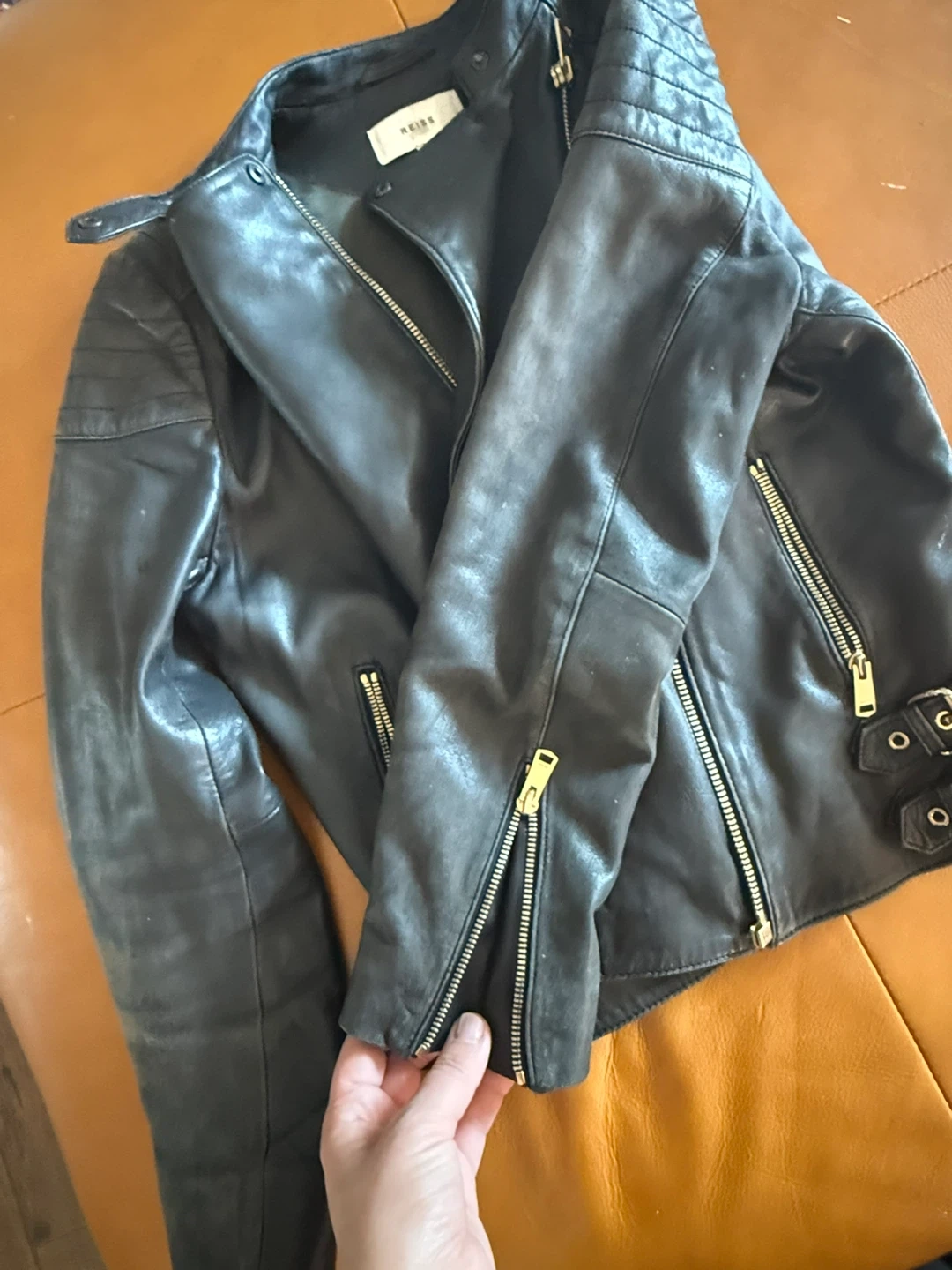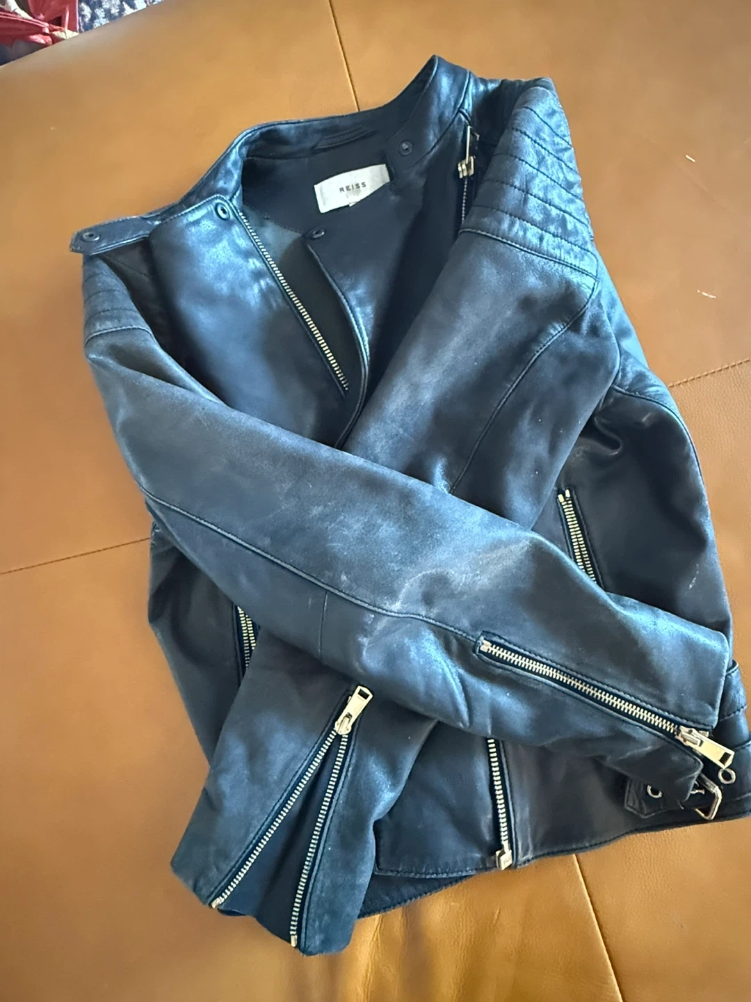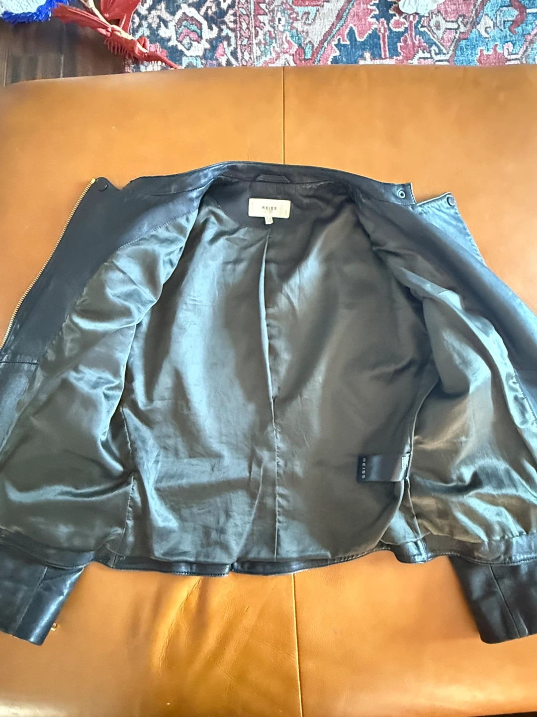 Classic Reiss black leather biker jacket. It's fully lined with a silky interior. This jacket offers zippered cuffs and a distinctive asymmetric zip front.