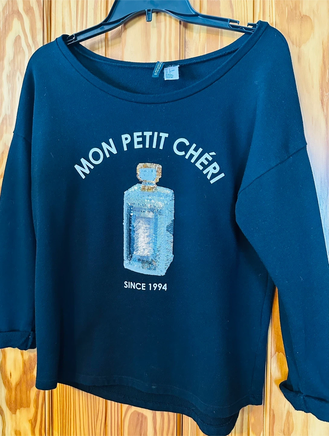 Black pullover sweatshirt with "Mon Petit Chéri" and a sequined perfume bottle graphic. Includes "SINCE 1994" text. Size is S.