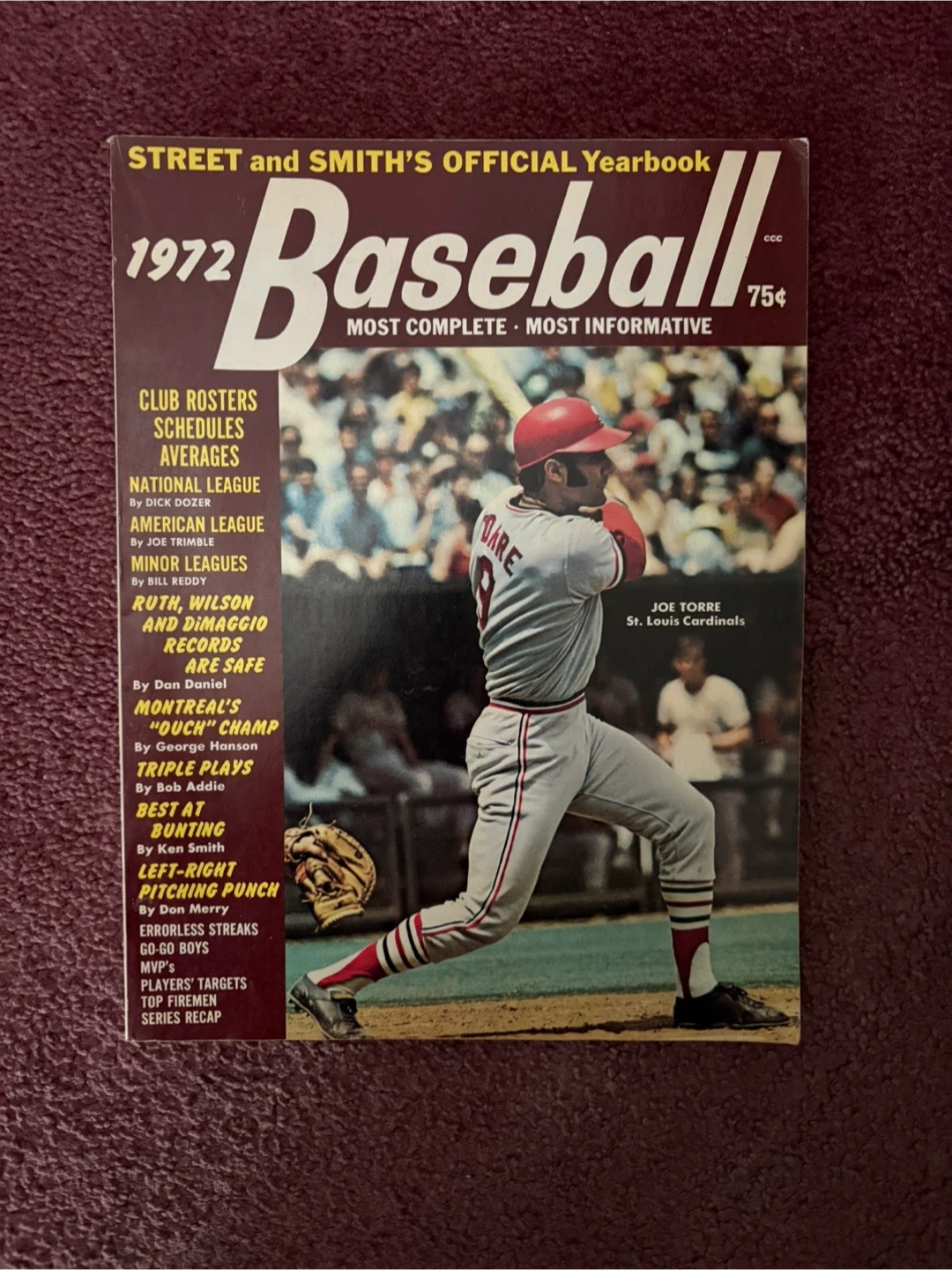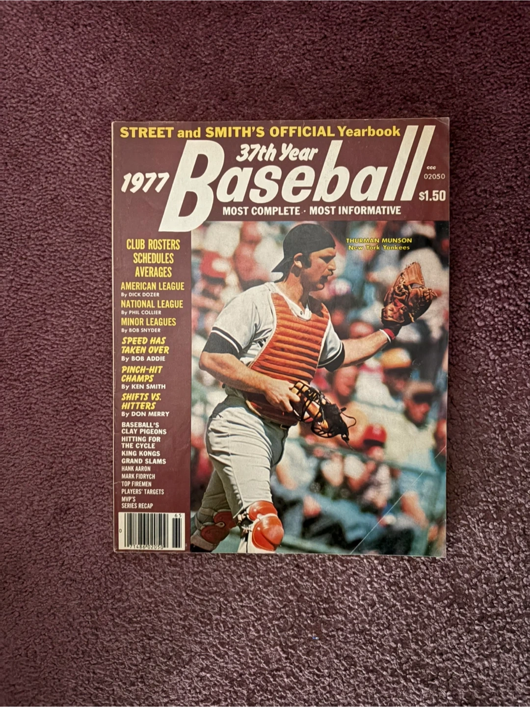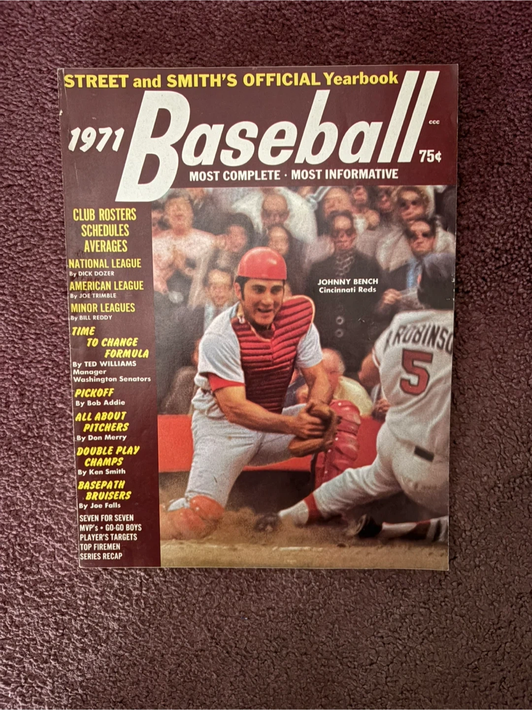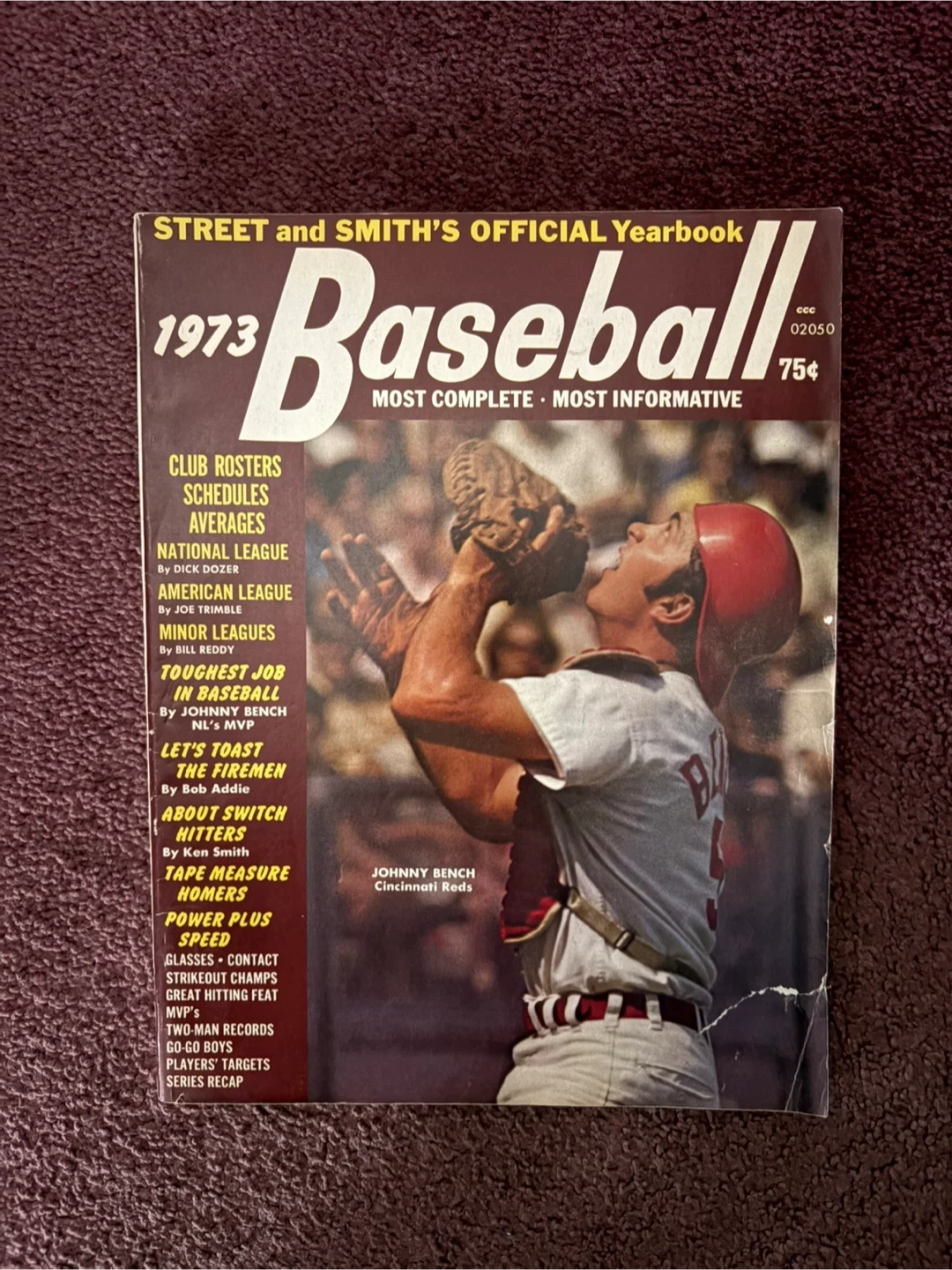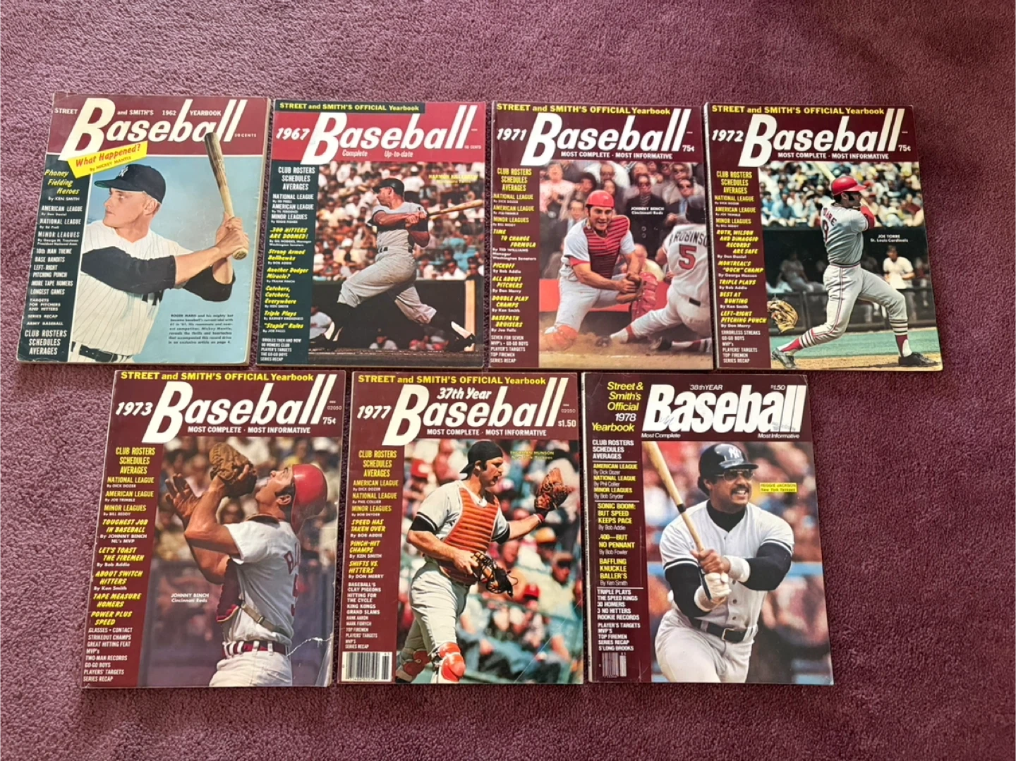 A collection of Vintage Street and Smith's Official Baseball Yearbooks from 1967, 1971, 1972, 1973, and 1977. These contain club rosters, schedules, averages, and various articles on players and baseball history. They're great for any baseball enthusiast looking to delve into past seasons!