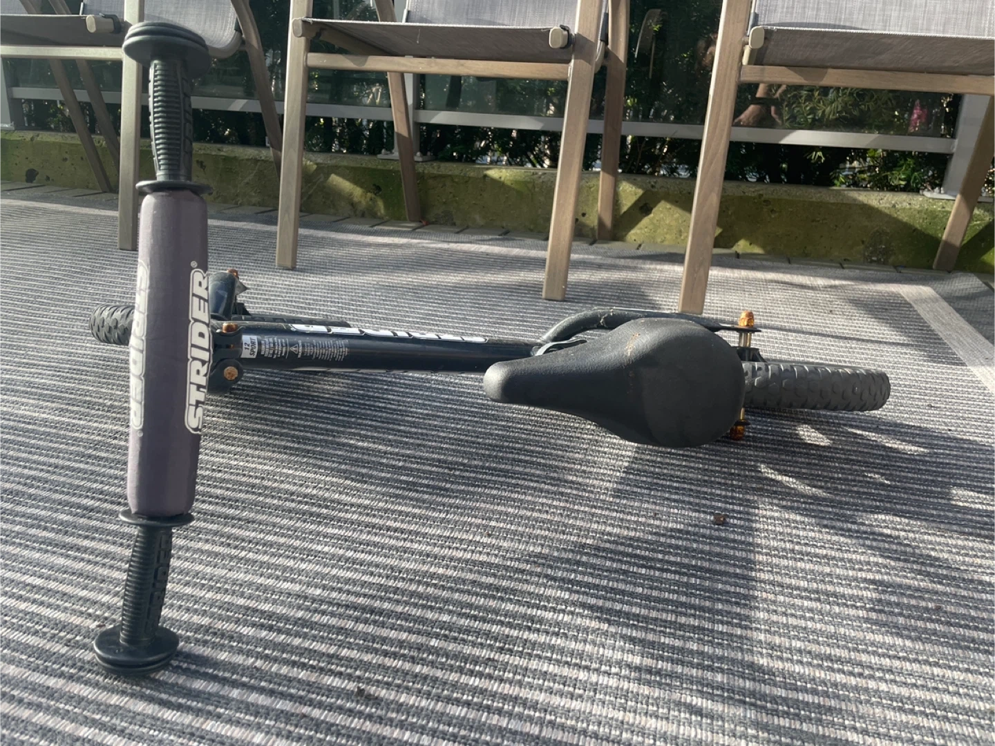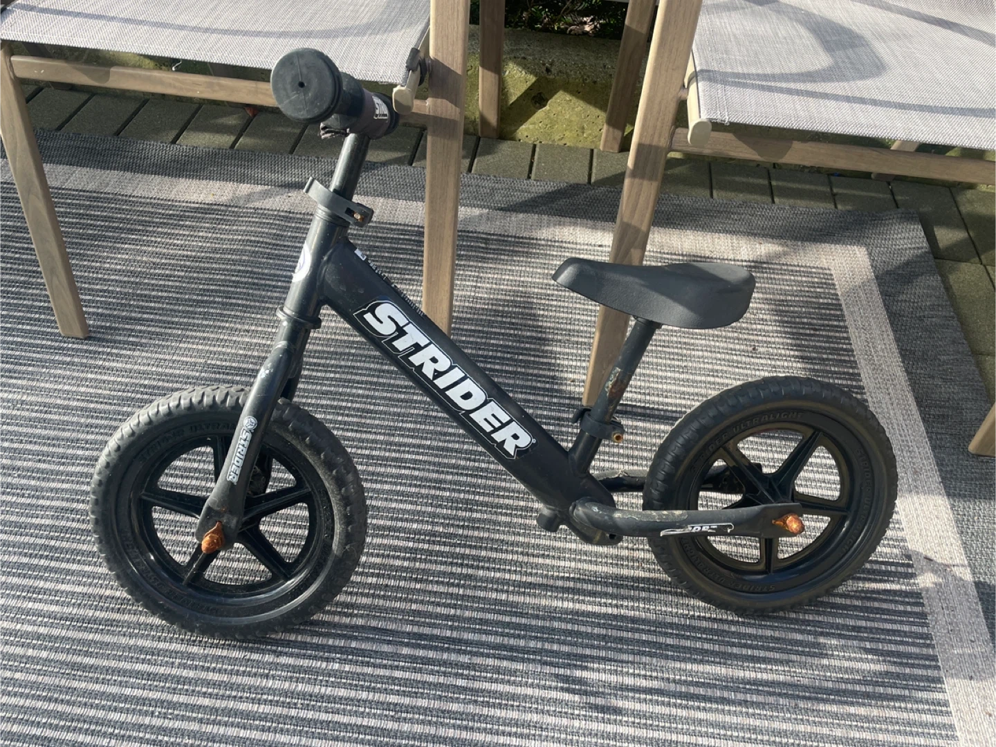 Black Strider balance bike for kids. It's a great way for little ones to learn balance and coordination before transitioning to a pedal bike. Features adjustable seat height.