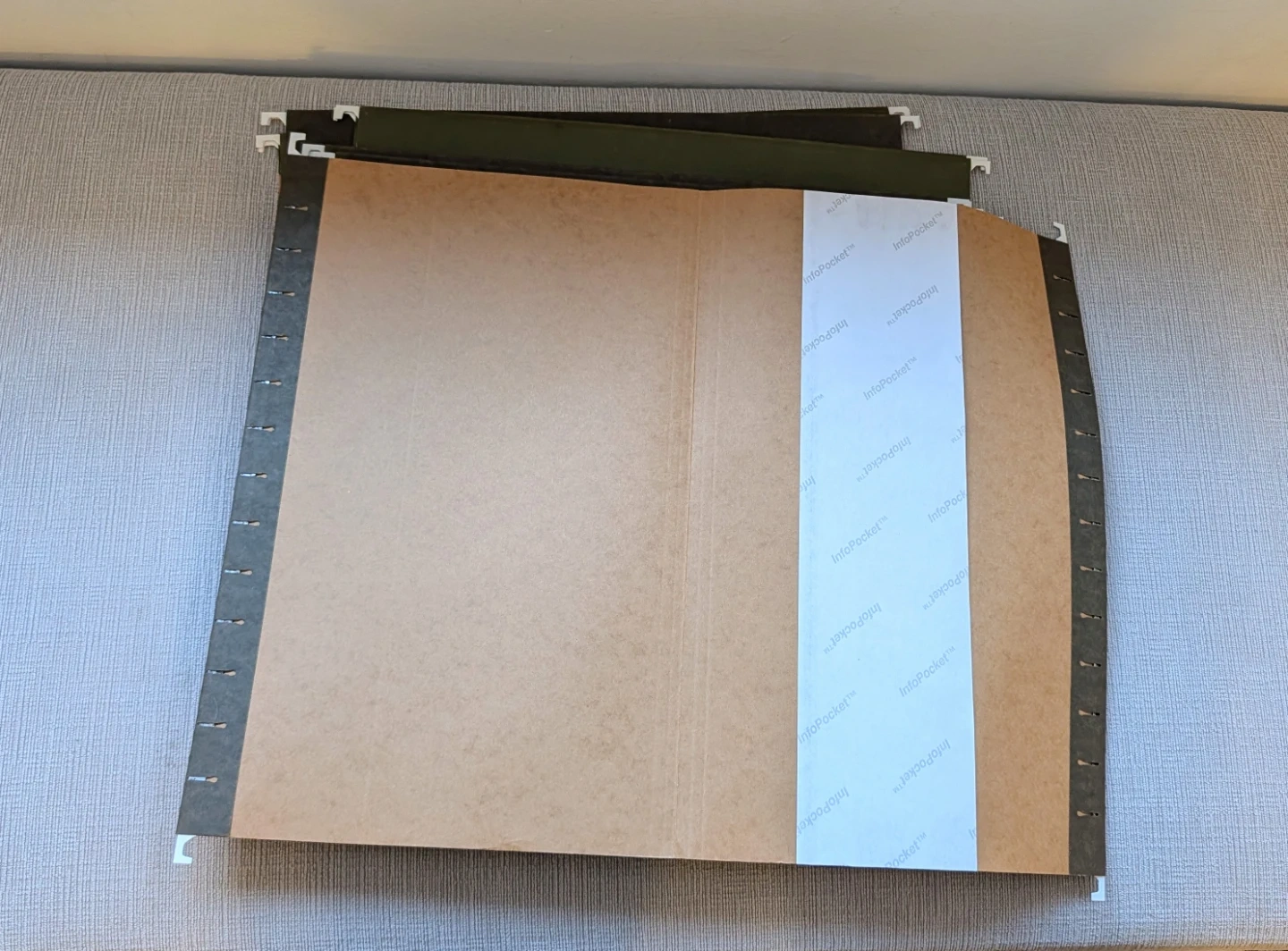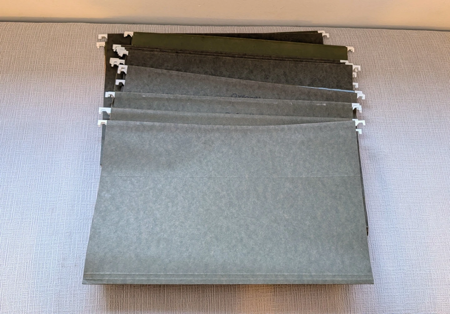 Bundle of Oxford hanging file folders. Green and grey colours. Cardboard material. They're useful for organizing documents and paperwork at home or in the office.