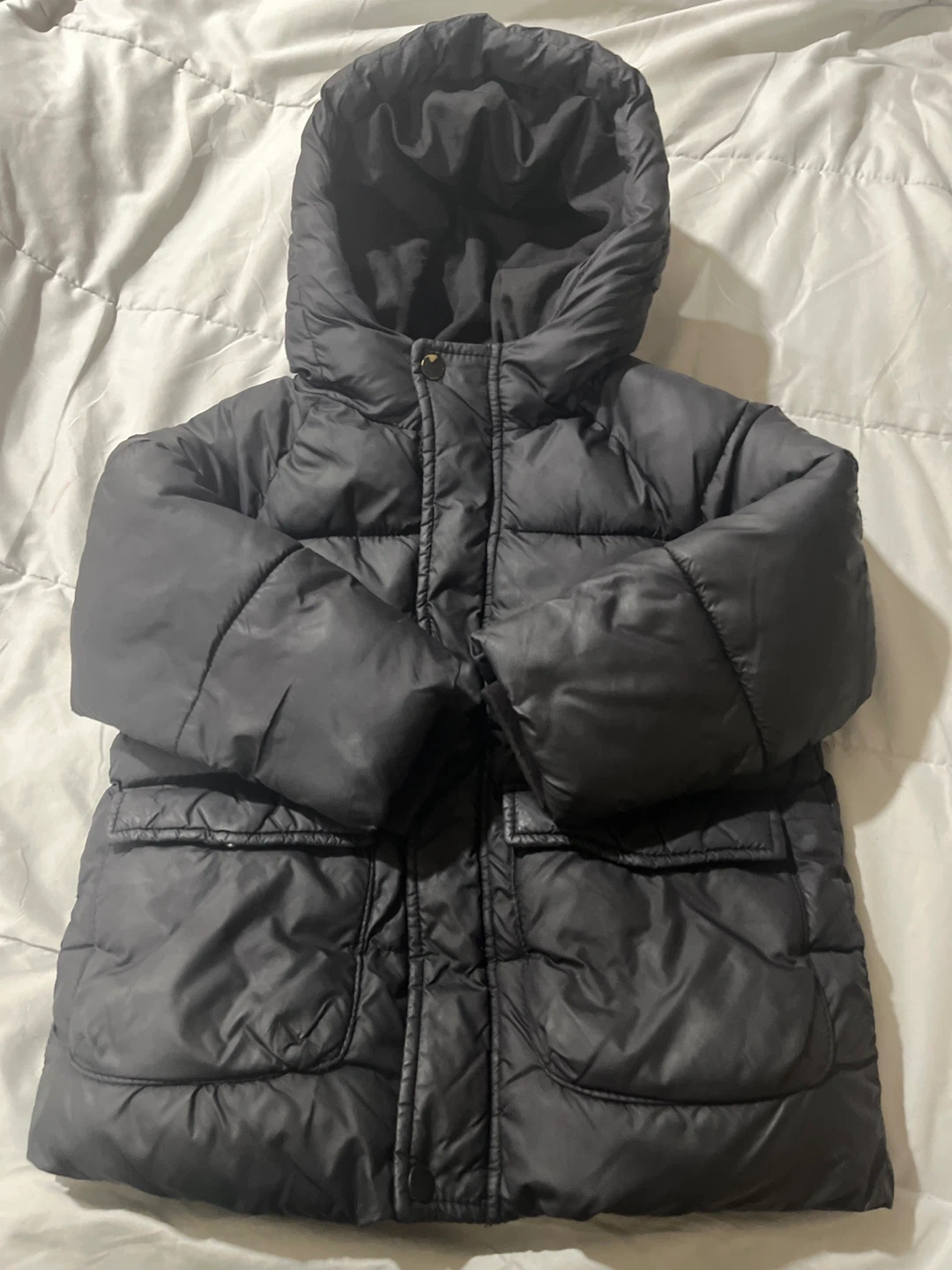 Grey puffer jacket from Zara. Features a hood and two front pockets. Size is 3-4 years, or 104cm. Made in Bangladesh.