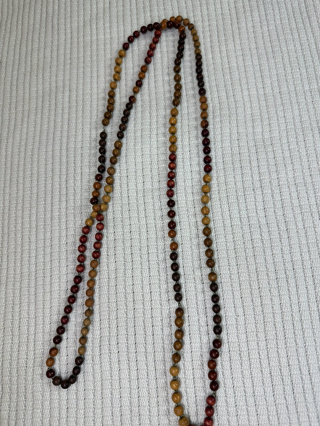 A long wooden bead necklace with in brown, red, and beige tone beads.