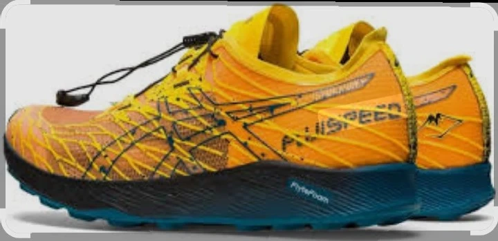 ASICS Gel-Speed trail running shoes in a vibrant orange and blue colorway. These shoes feature a quick-lace system and FlyteFoam cushioning. Designed for performance on varied terrain. Sise 10