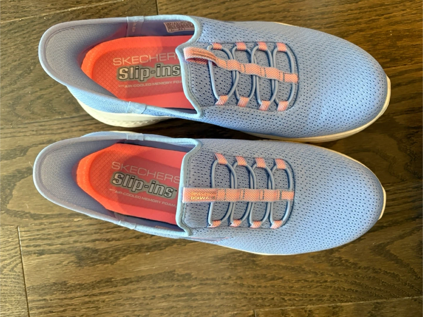 These are Skechers Go Walk Slip-ins designed for hands-free wear. They feature an air-cooled memory foam insole that increases softness and breathability. The exclusive heel pillow holds your foot securely in place for easy slip-on comfort. Perfect for anyone who wants quick and comfortable footwear!