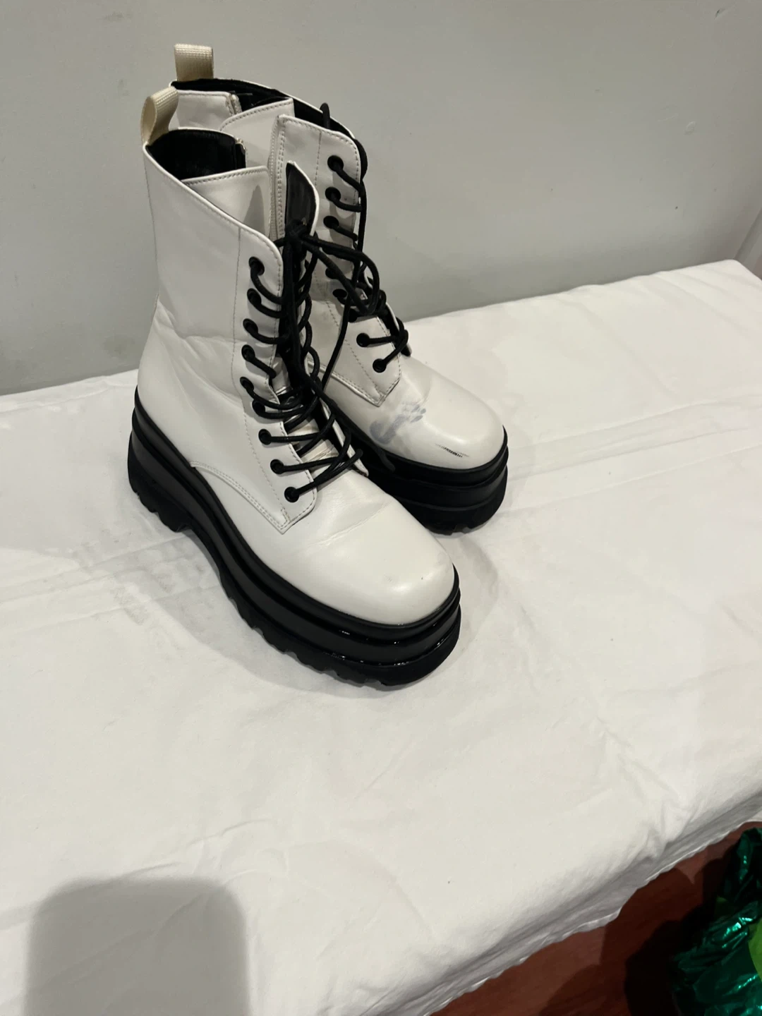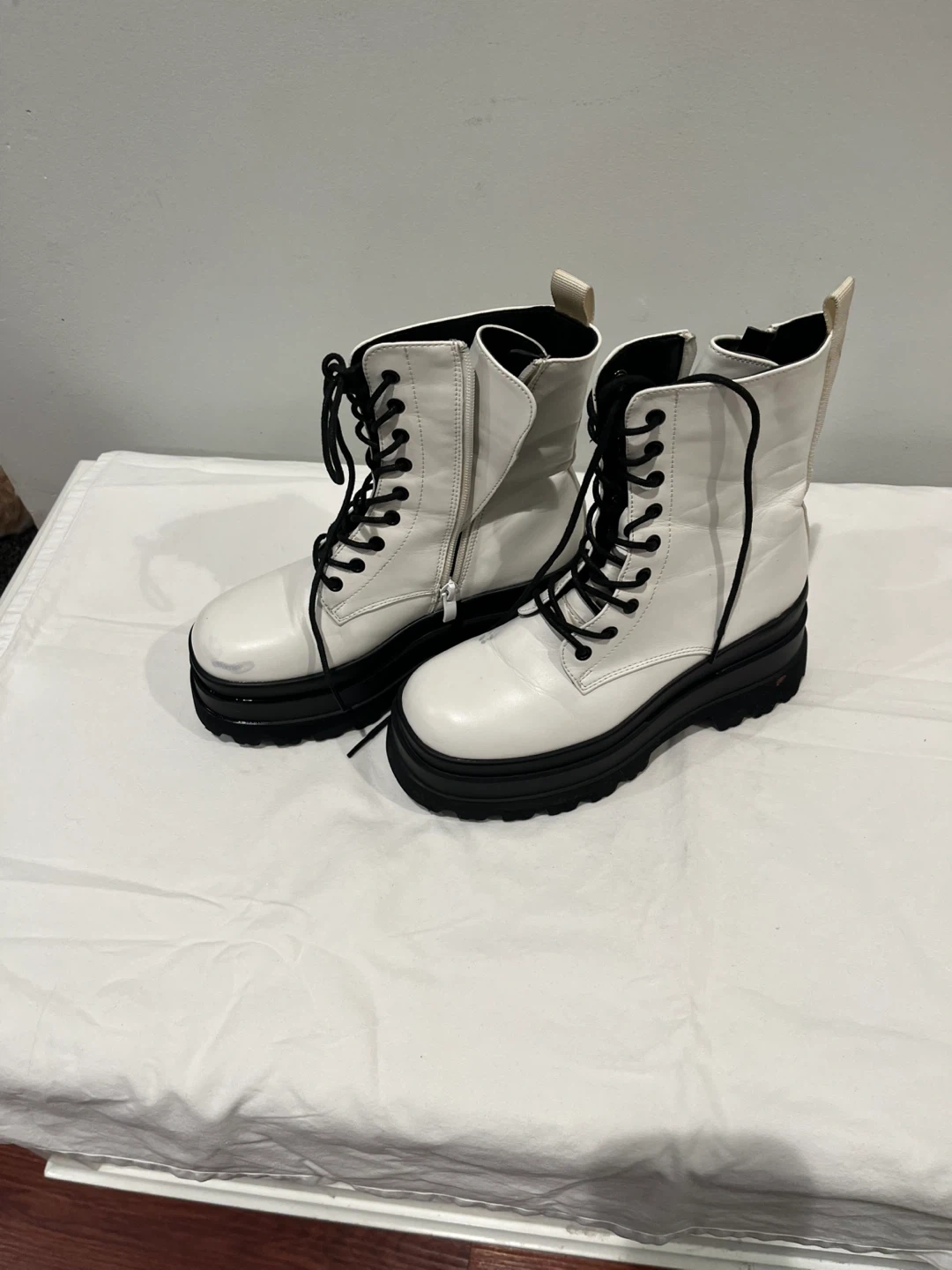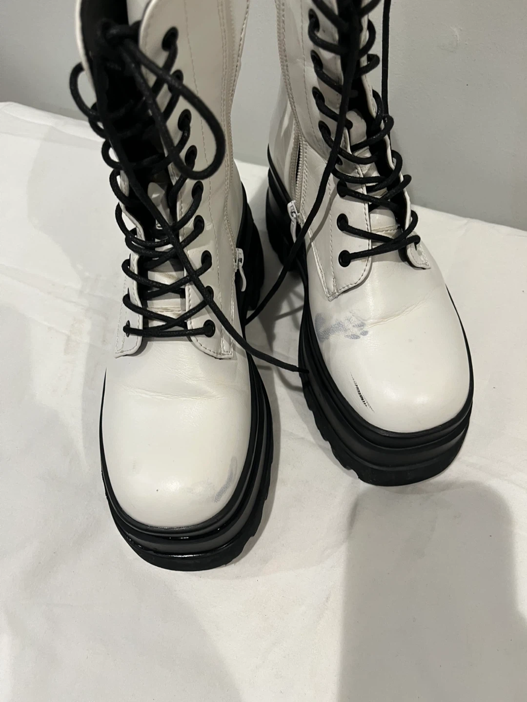 White faux leather combat boots with black platform soles and laces. They feature side zippers for easy on and off. Some minor scuffs visible on the toes.