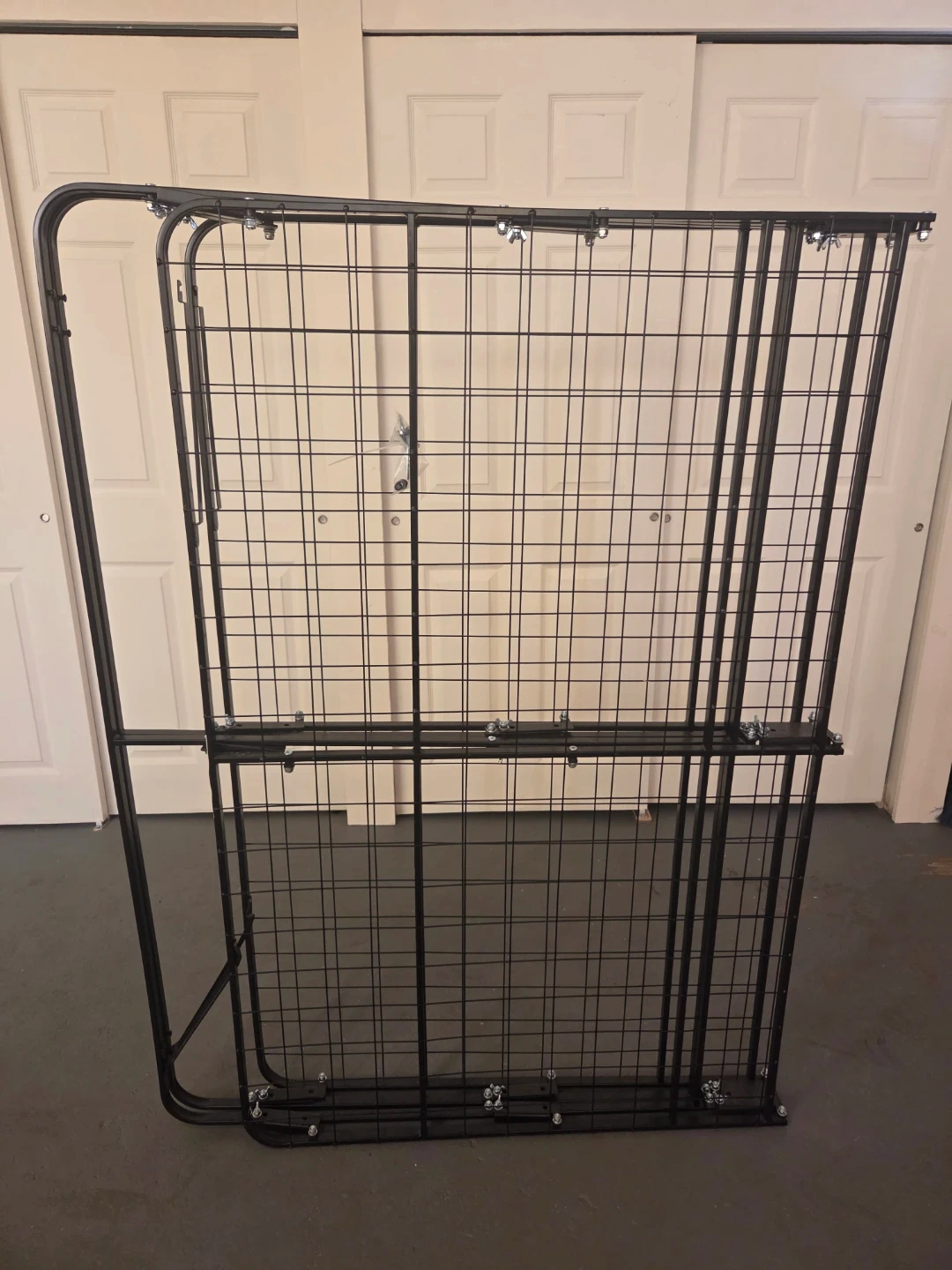 This is a black metal folding bed frame. It's designed for easy setup and storage. The metal wire mesh provides sturdy support for your mattress.