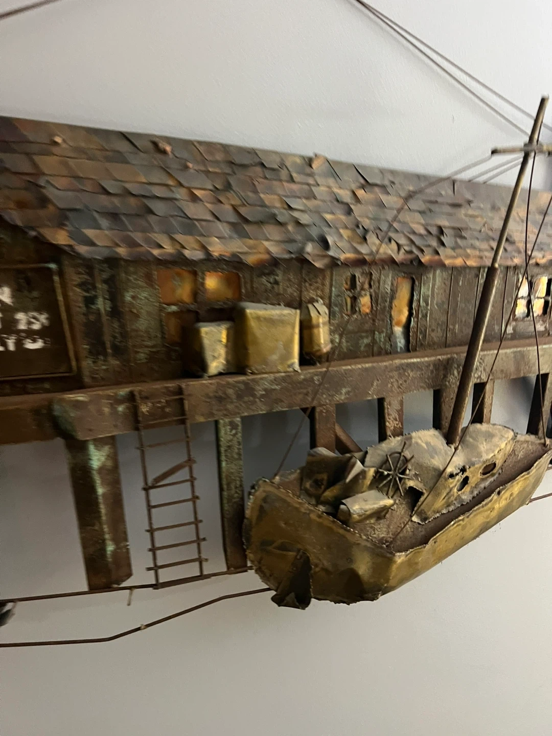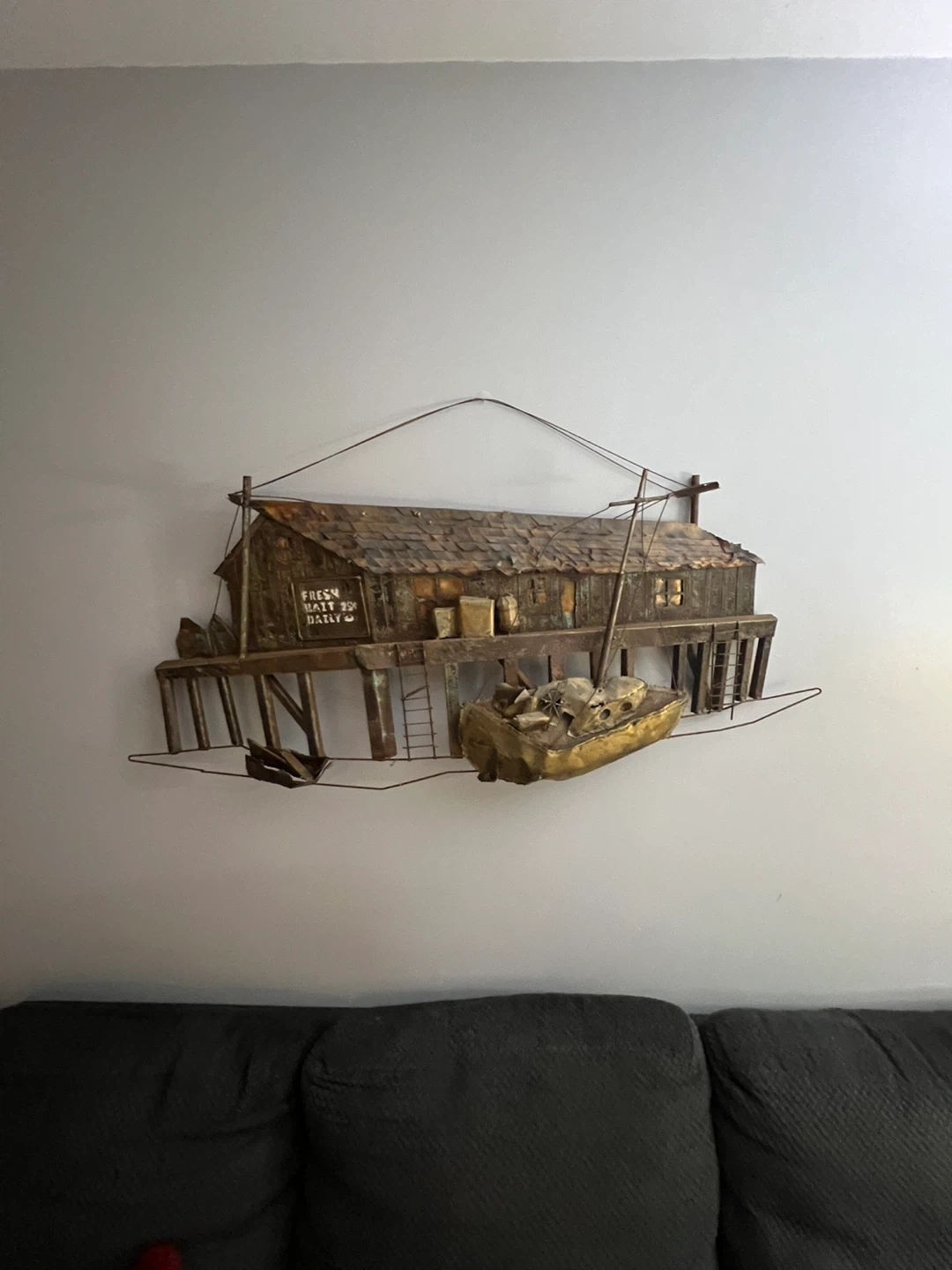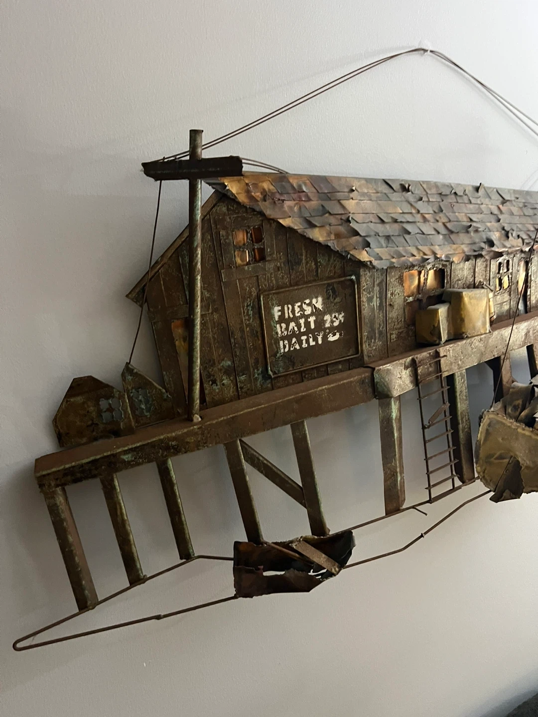 This unique metal wall art depicts a rustic fishing shack with a boat docked. The piece has a weathered, antique look, crafted from metal with a brass-toned boat. It's a detailed sculpture, perfect for adding character to any space.