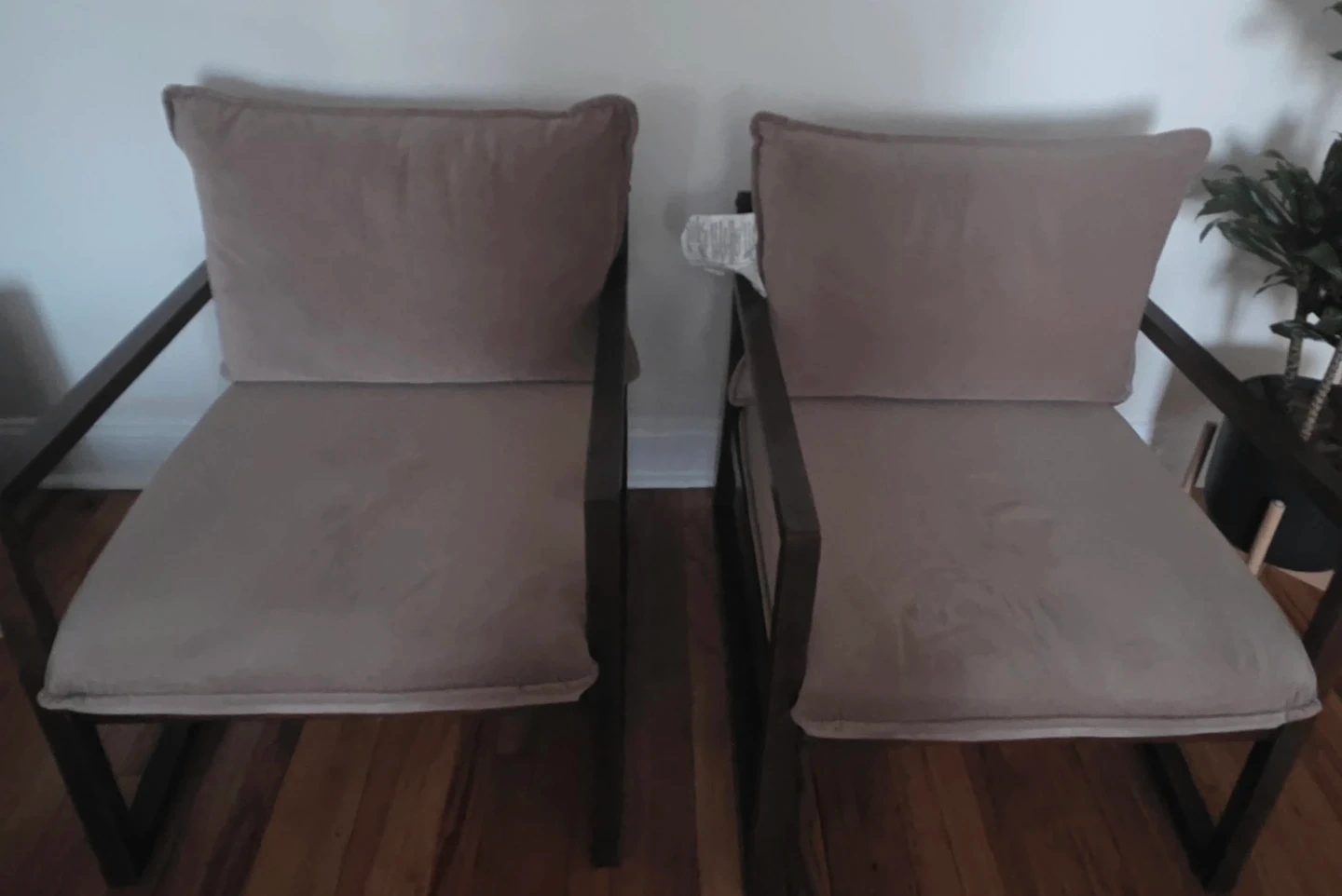 A set of two comfortable accent chairs with a wooden frame. The upholstered seats and backrests are a neutral taupe color. These chairs are perfect for adding extra seating to any room. Wood frame construction.