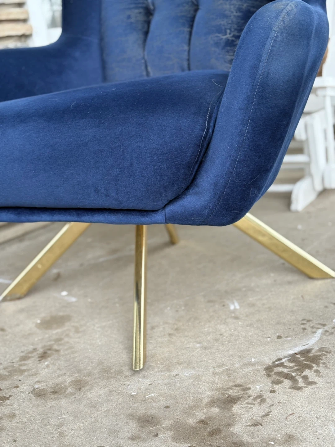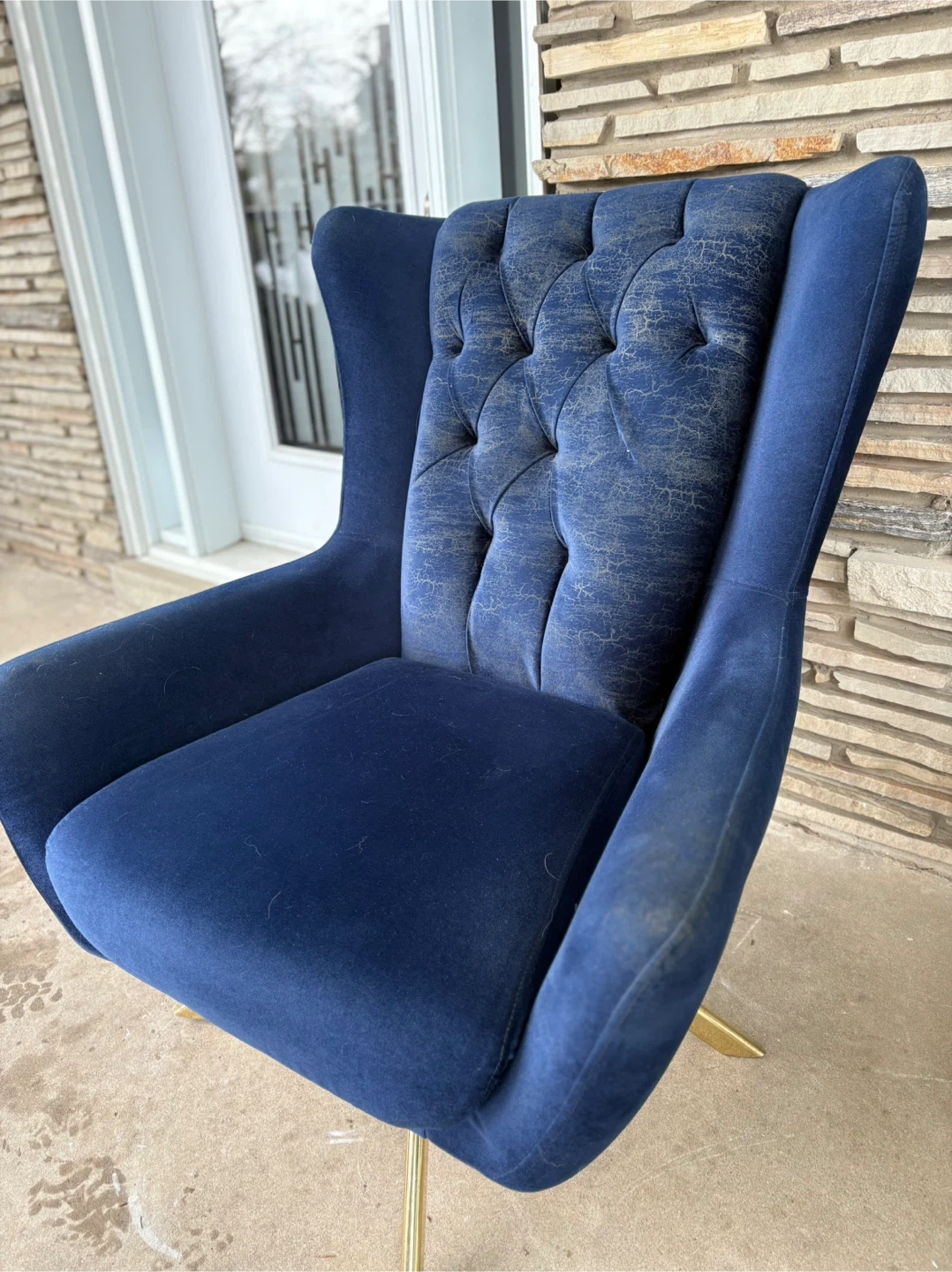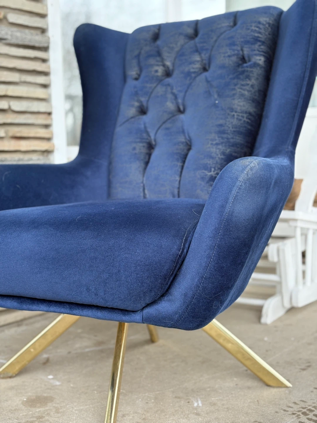 Deep blue velvet accent chair featuring a tufted back. It has a stylish gold-tone metal base. The velvet on the tufted back shows some wear, but it's still a statement piece for any room.
