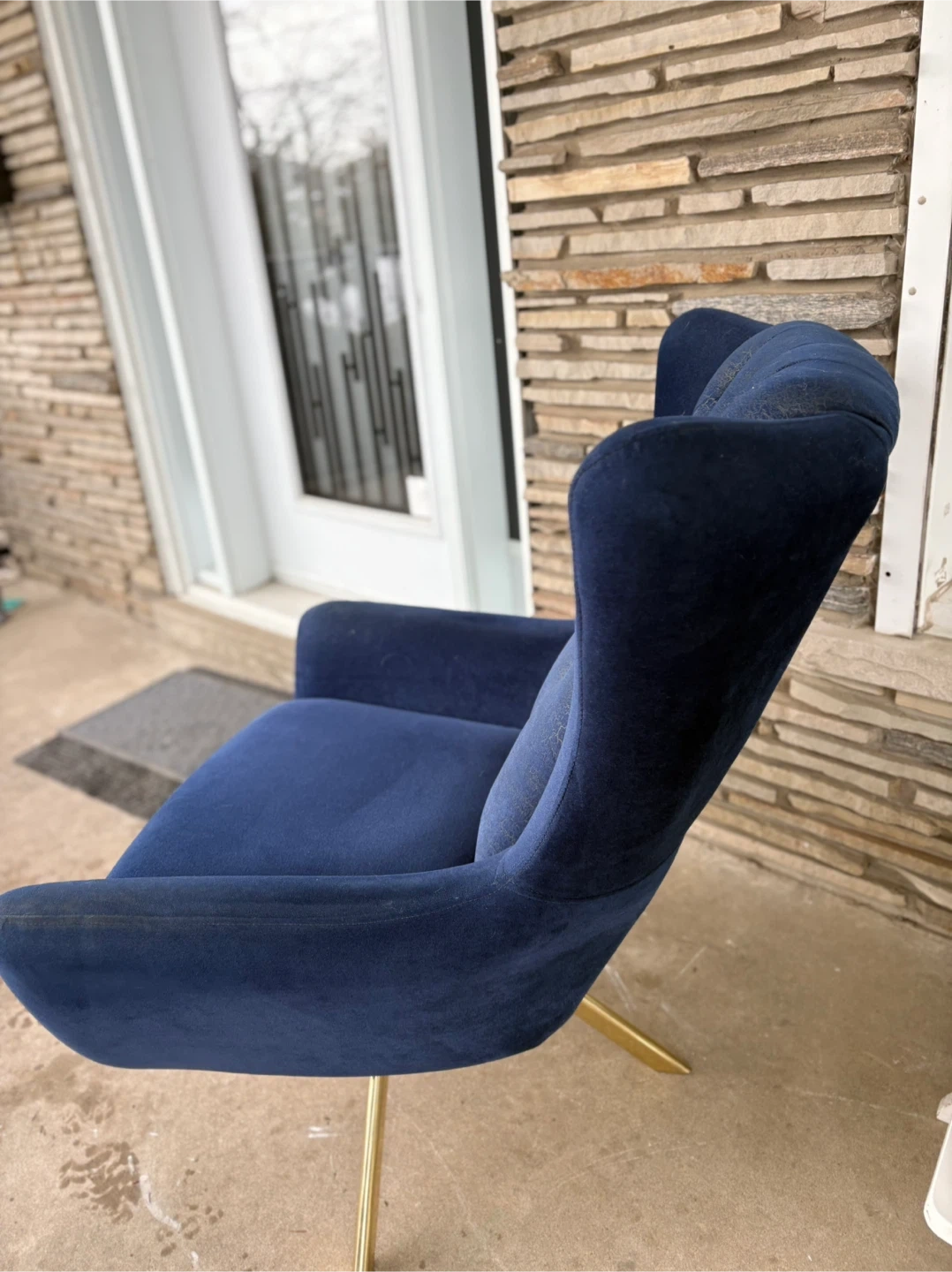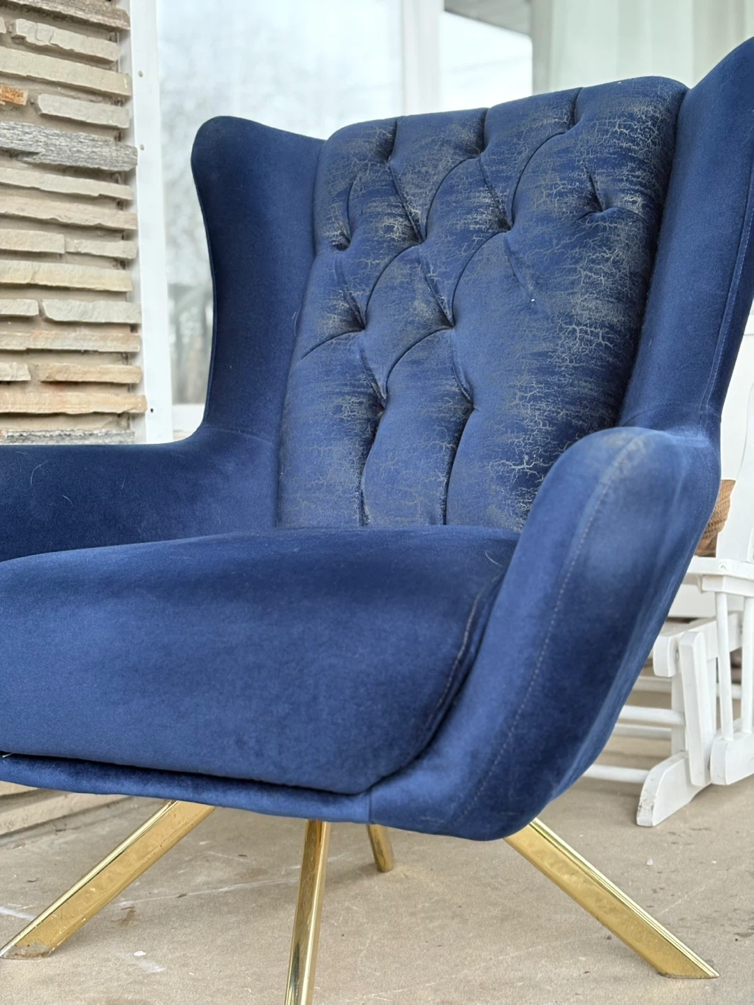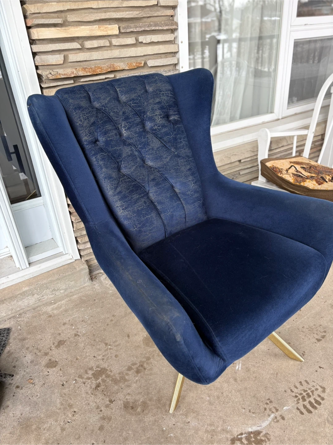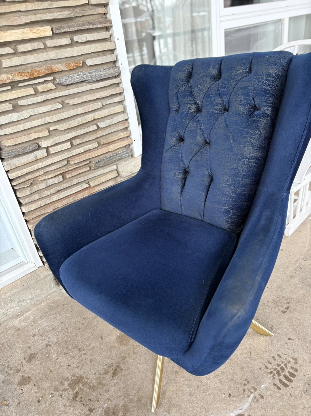 Deep blue velvet accent chair featuring a tufted back. It has a stylish gold-tone metal base. The velvet on the tufted back shows some wear, but it's still a statement piece for any room.
