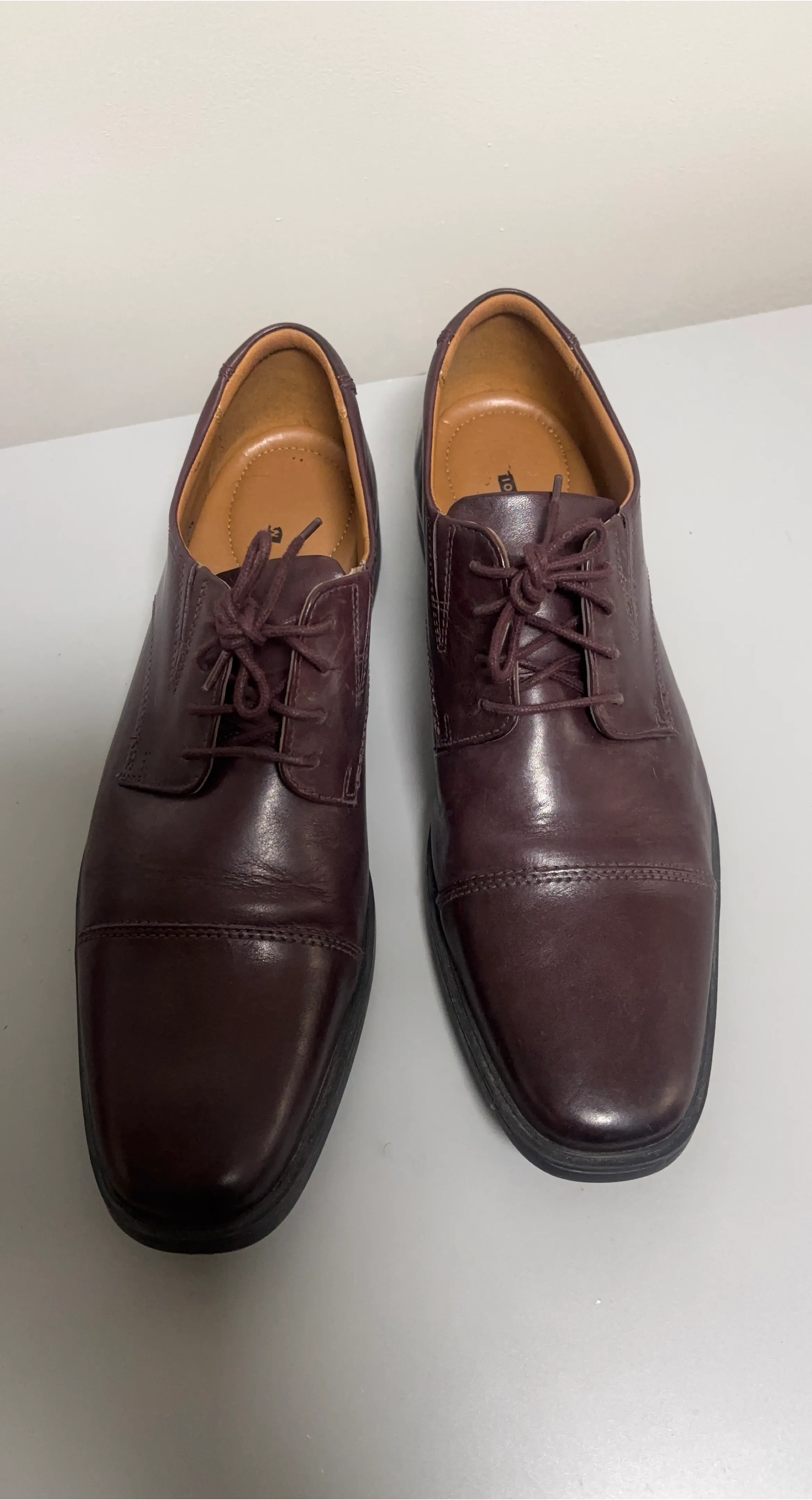 These are men's dress shoes from Clarks. They're made of leather with a cap toe design. Features a lace-up closure. This pair is ideal for formal occasions.