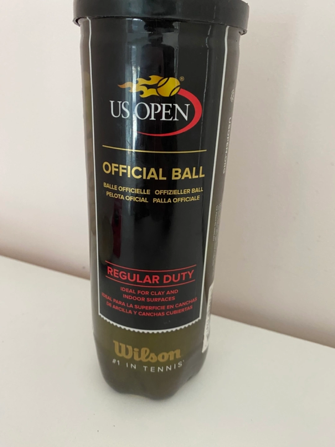 A container of tennis balls. The container is cylindrical. It has a black top and bottom. It features the US Open logo and text. A nice way to spend time outside with friends.