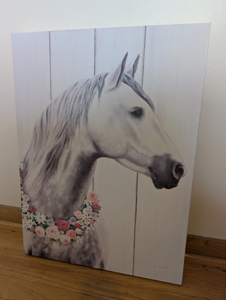 This is a canvas wall art piece featuring a horse with a floral wreath. It's in great condition and ready to add a touch of charm to your home. hangs on the wall