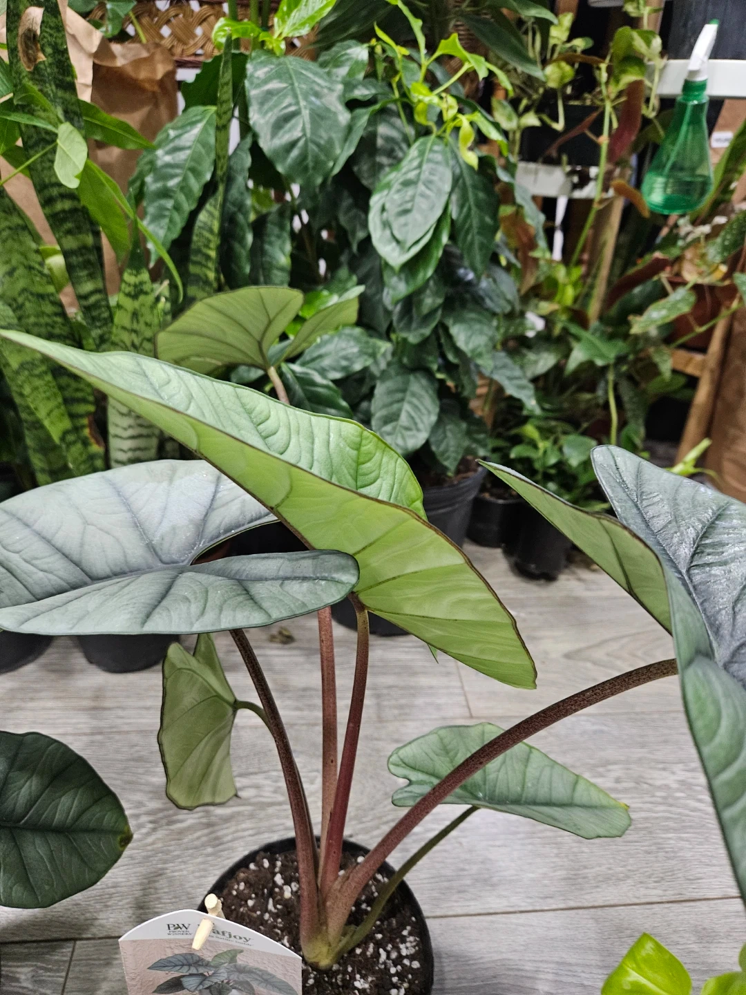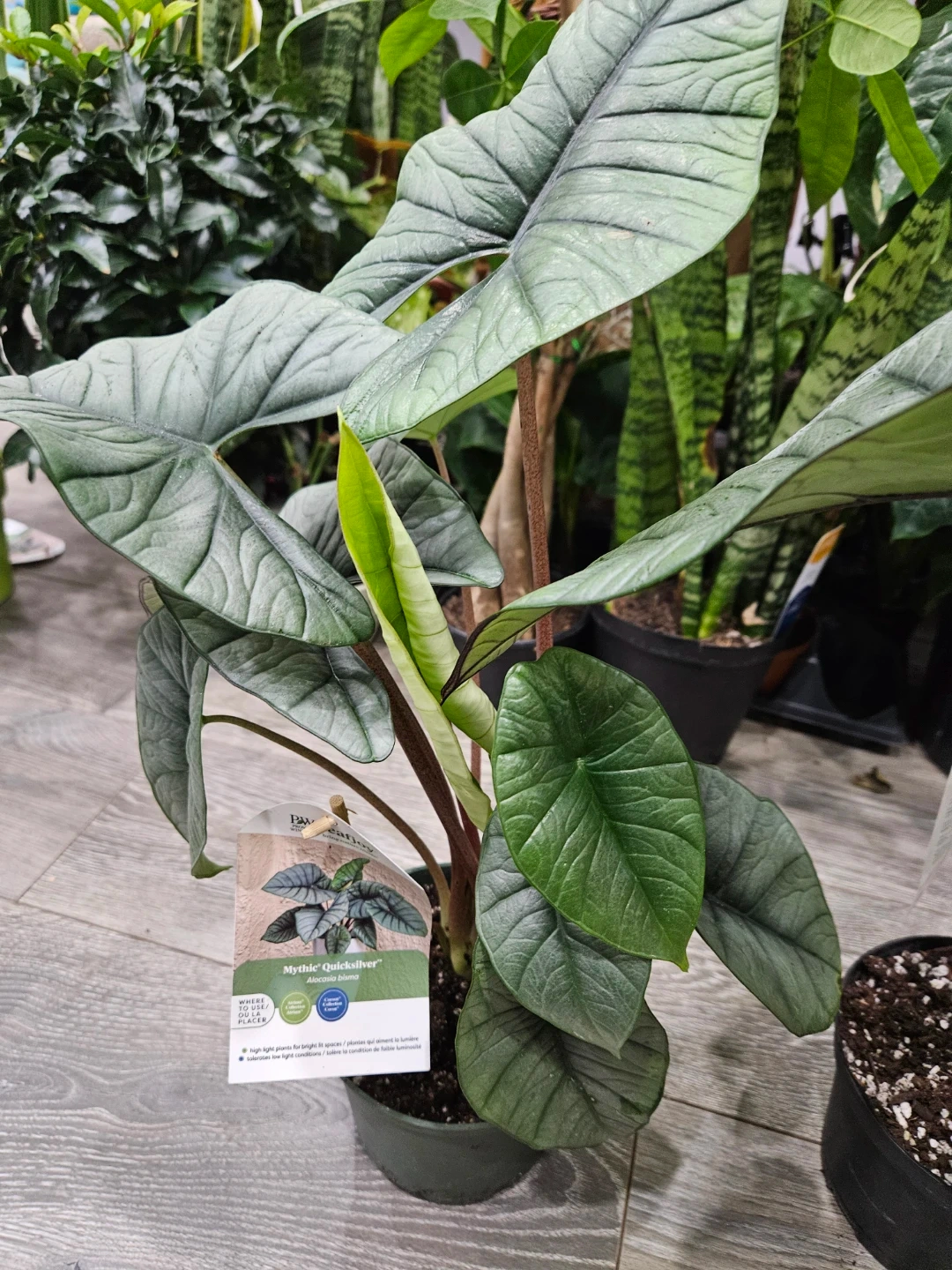 This Alocasia 'Mythic' Quicksilver plant boasts striking silvery-grey leaves with dark green veins. It's an eye-catching addition to any indoor space. Prefers bright, indirect light and consistent moisture.