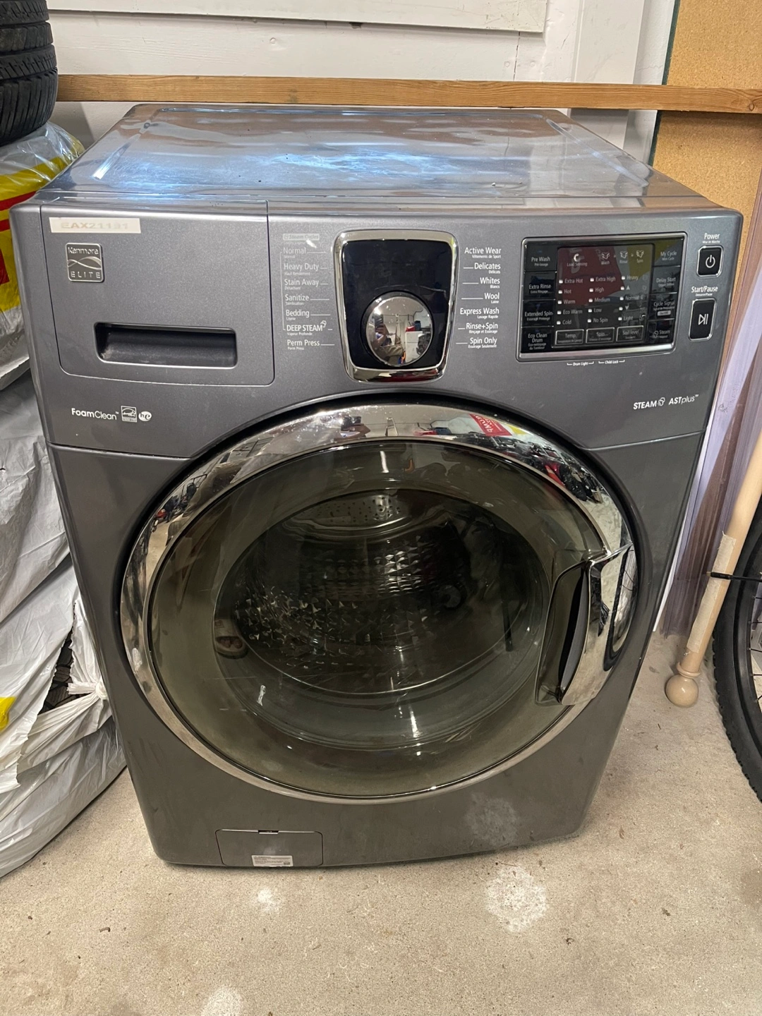 Selling a Kenmore Elite washing machine with FoamClean technology. It has various wash cycles including Normal, Heavy Duty, Delicates, and Active Wear. Also features Stain Away, Sanitize, Bedding, and Deep Steam options. It also has Steam ASTplus™.