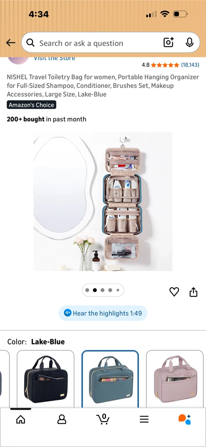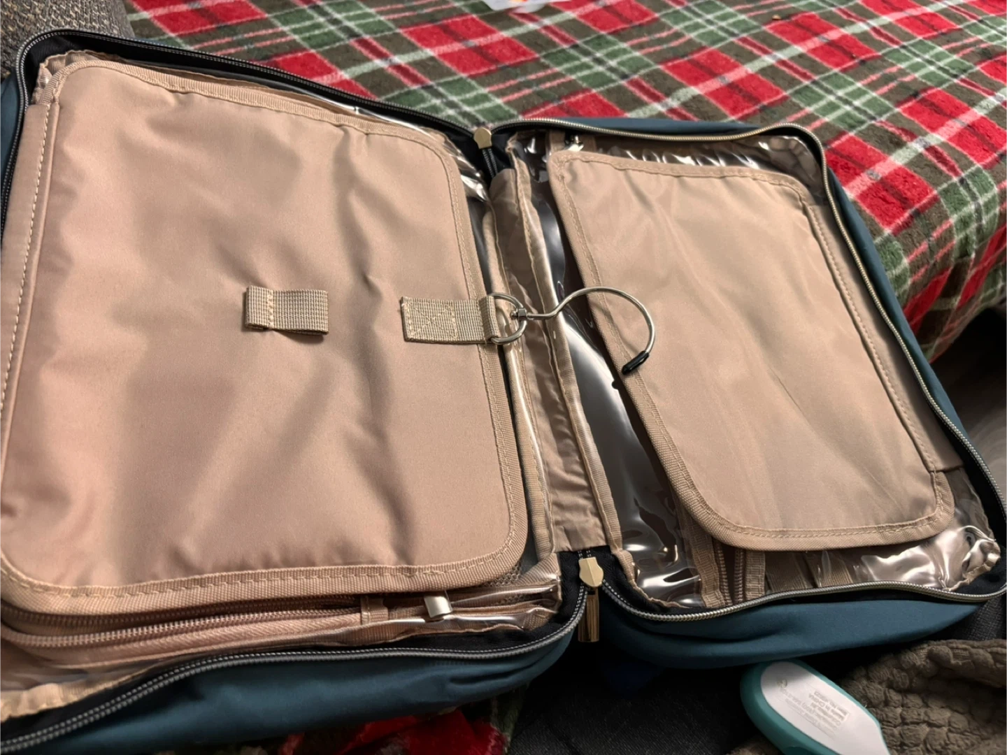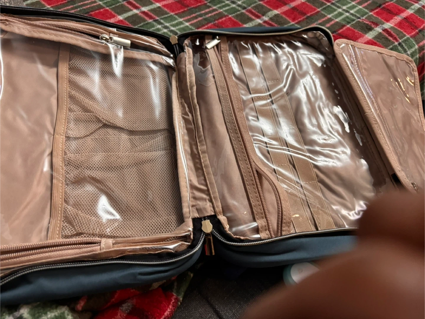 This is a Nishel travel toiletry bag. It features multiple compartments and clear pockets for organization. It also has a hanging hook for easy access.
