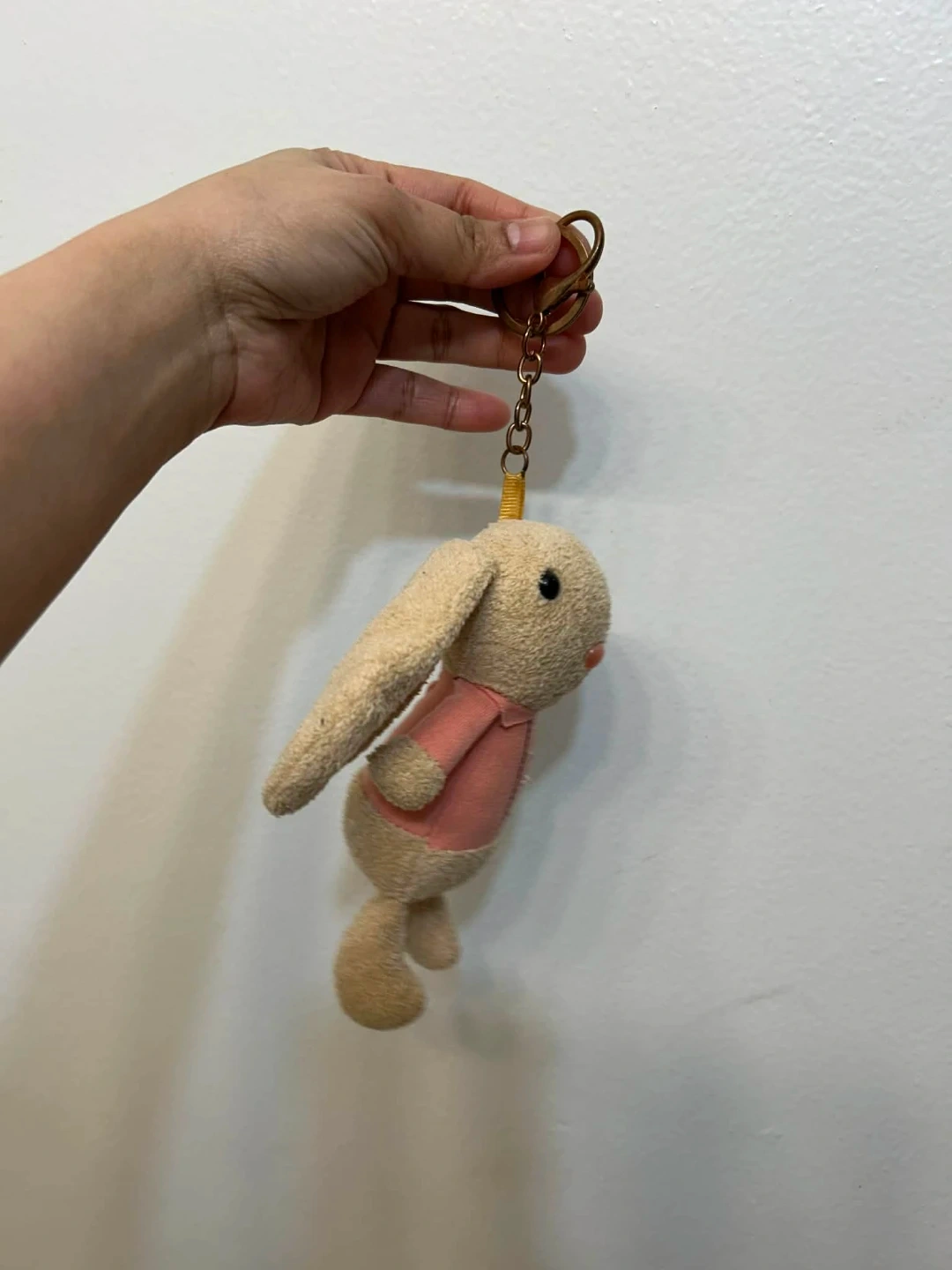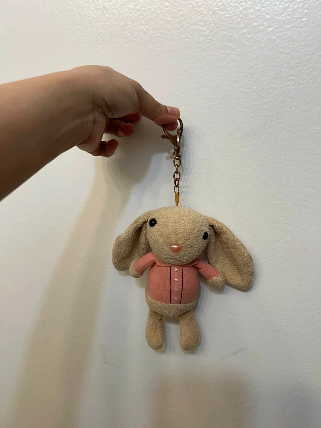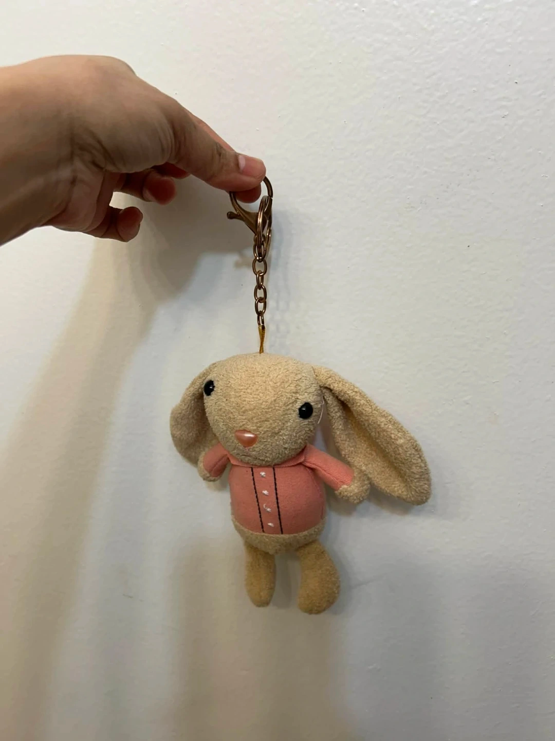 A cute plush bunny keychain with a pink shirt. It's a fun accessory for bags or keys. This keychain is a charming little gift for anyone who loves bunnies!