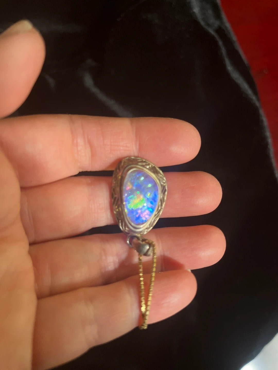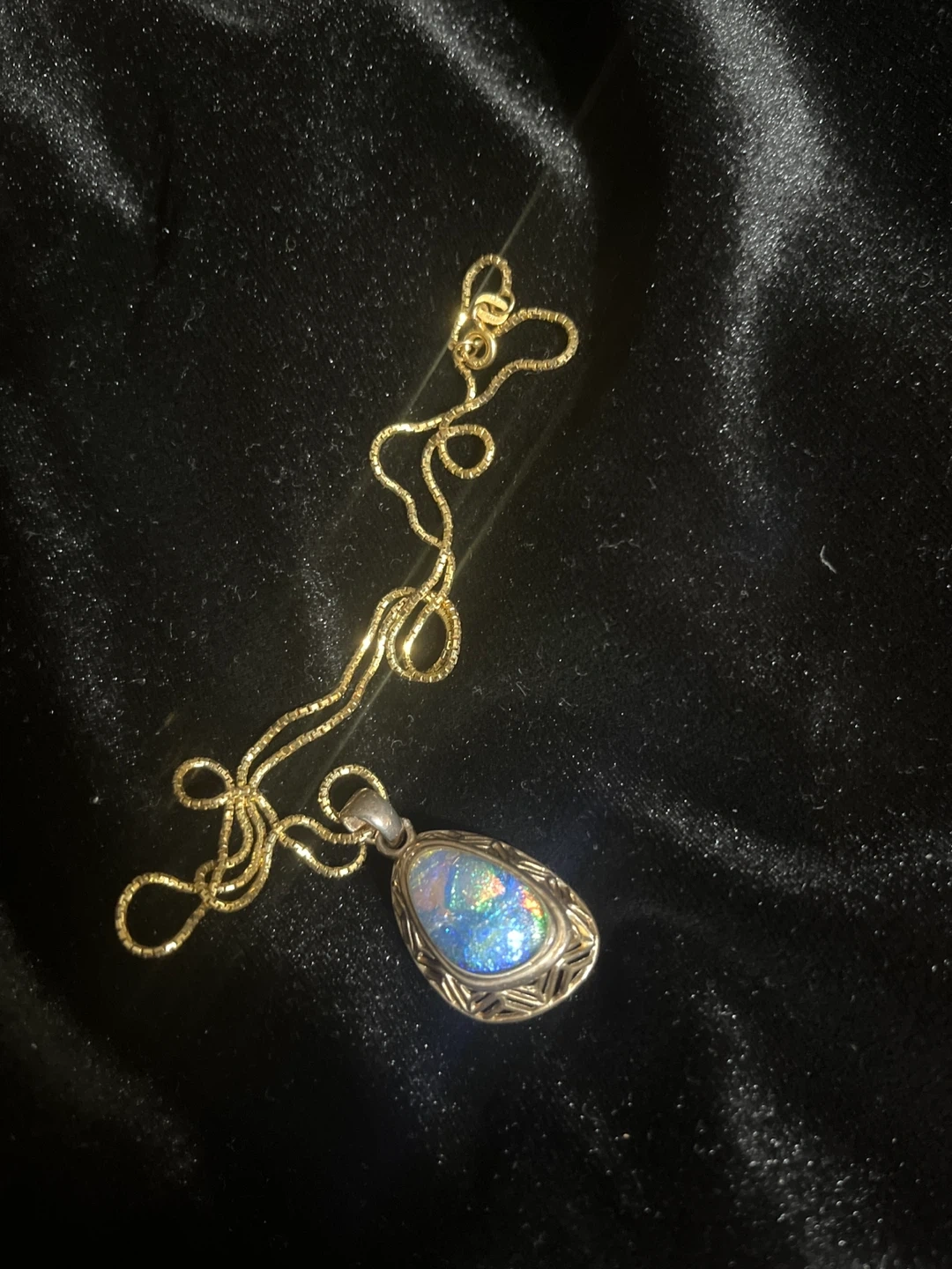 This necklace features a striking hand made opal stone looking glass set in a sterling silver pendant with an intricate filigree design. It hangs on a delicate chain.