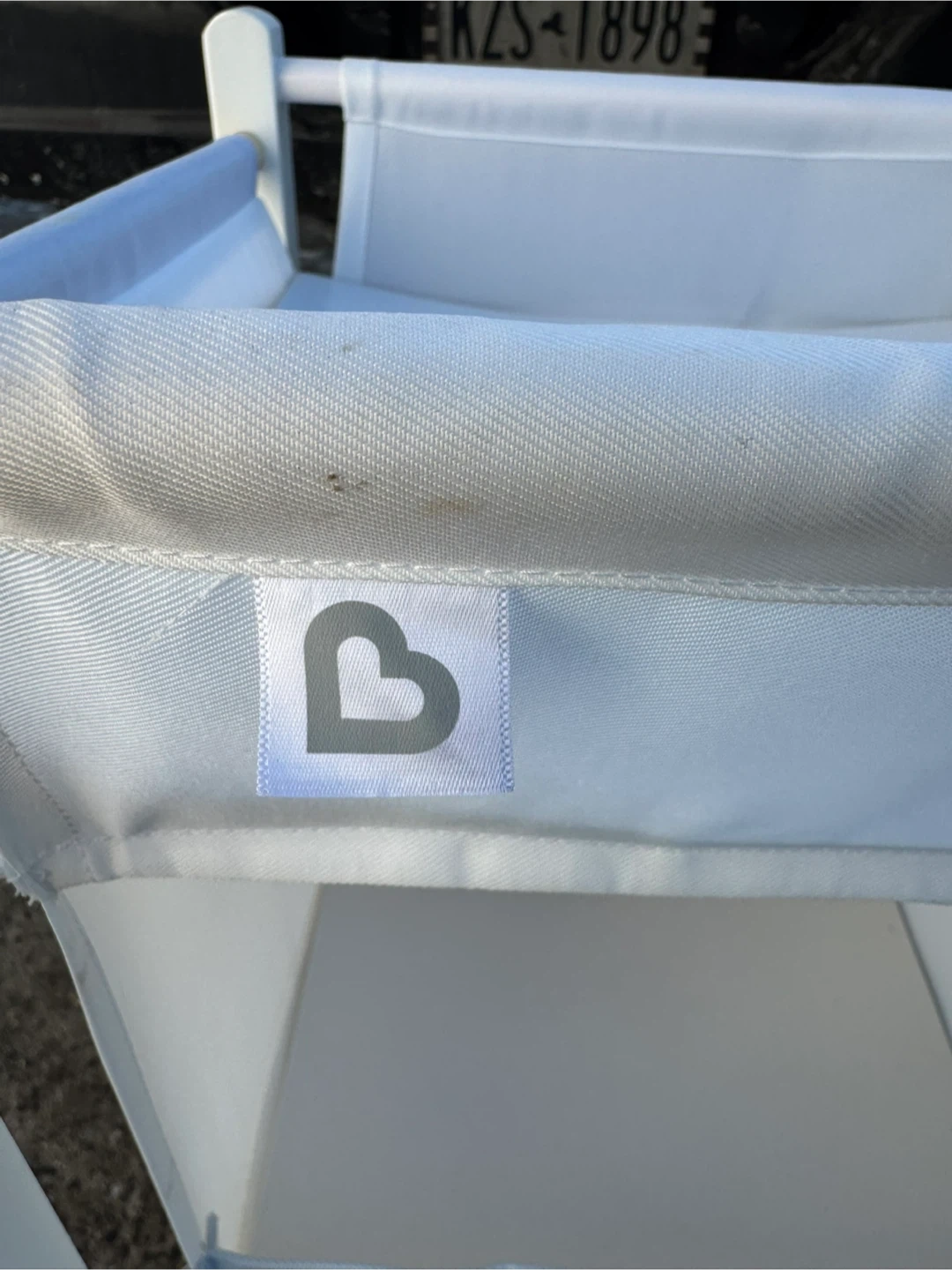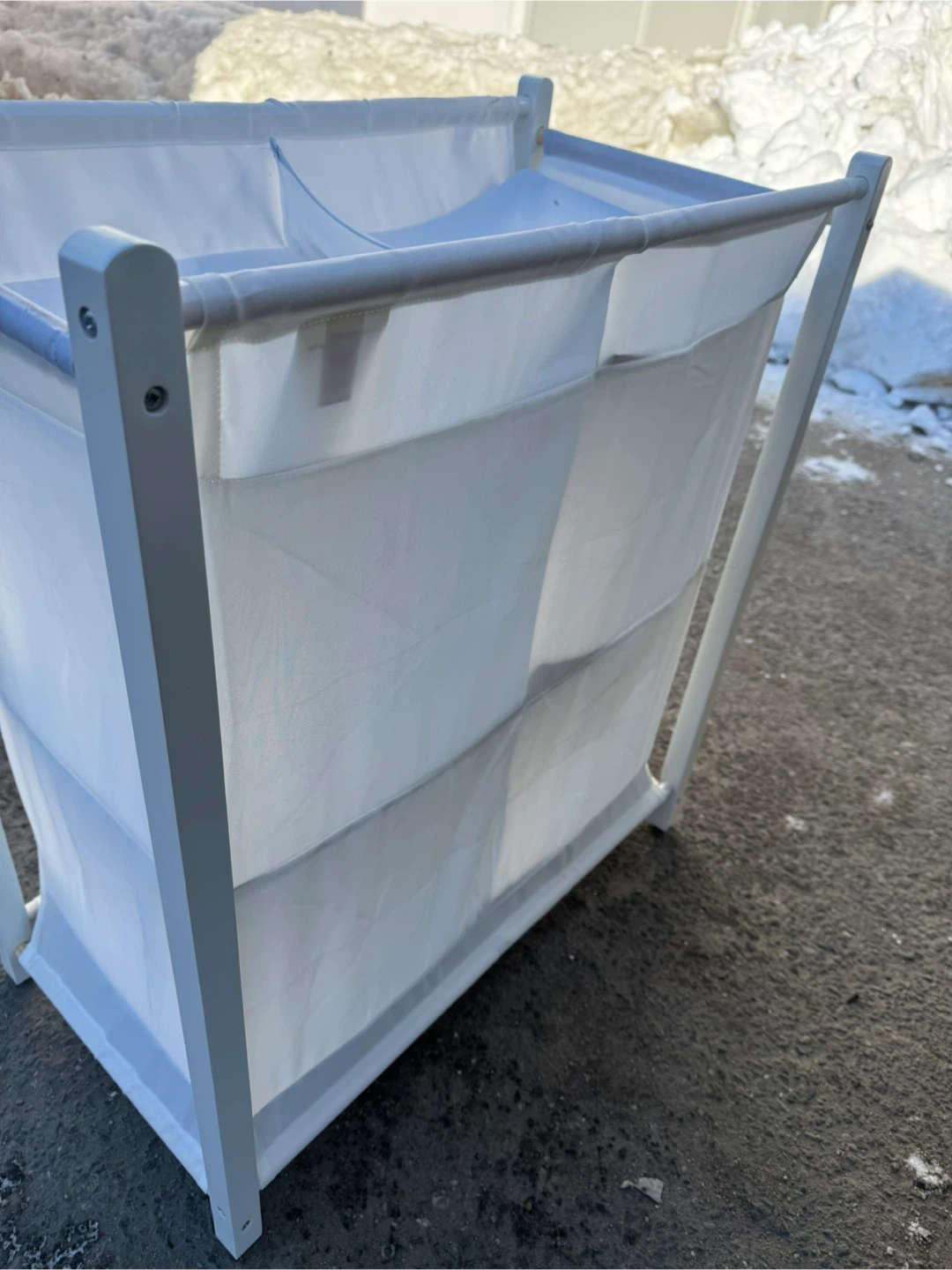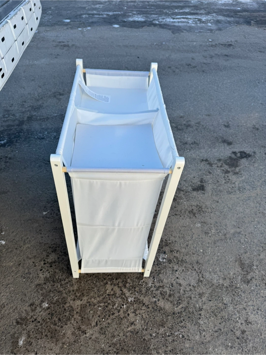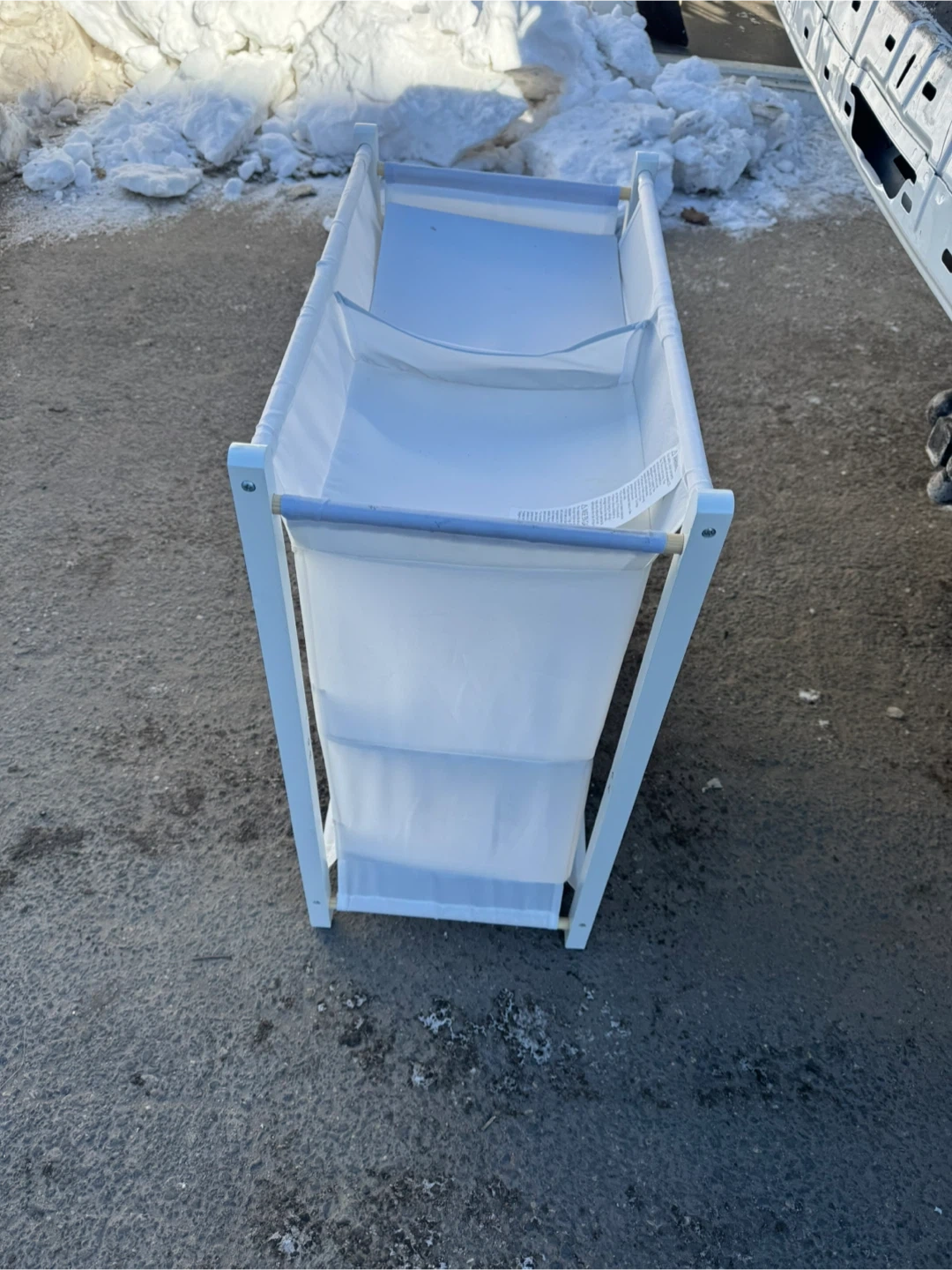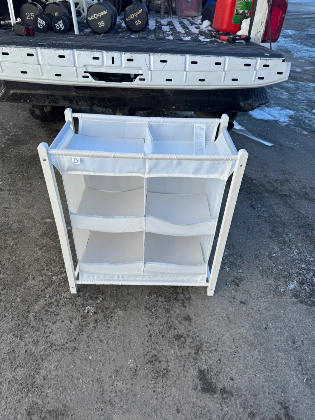 This is a white fabric and wood baby organizer shelf unit. It's got multiple shelves for storage. It's perfect for a nursery!