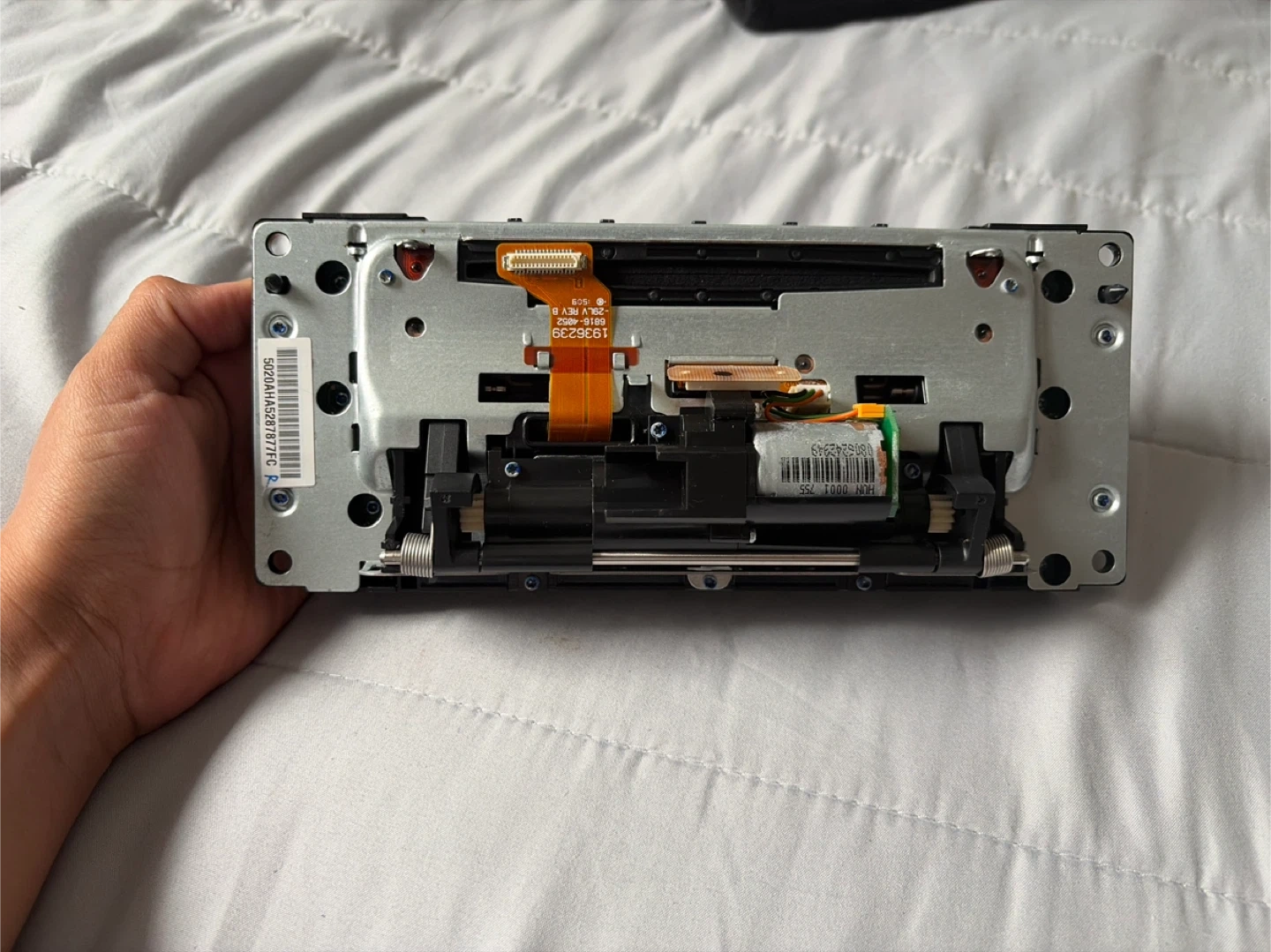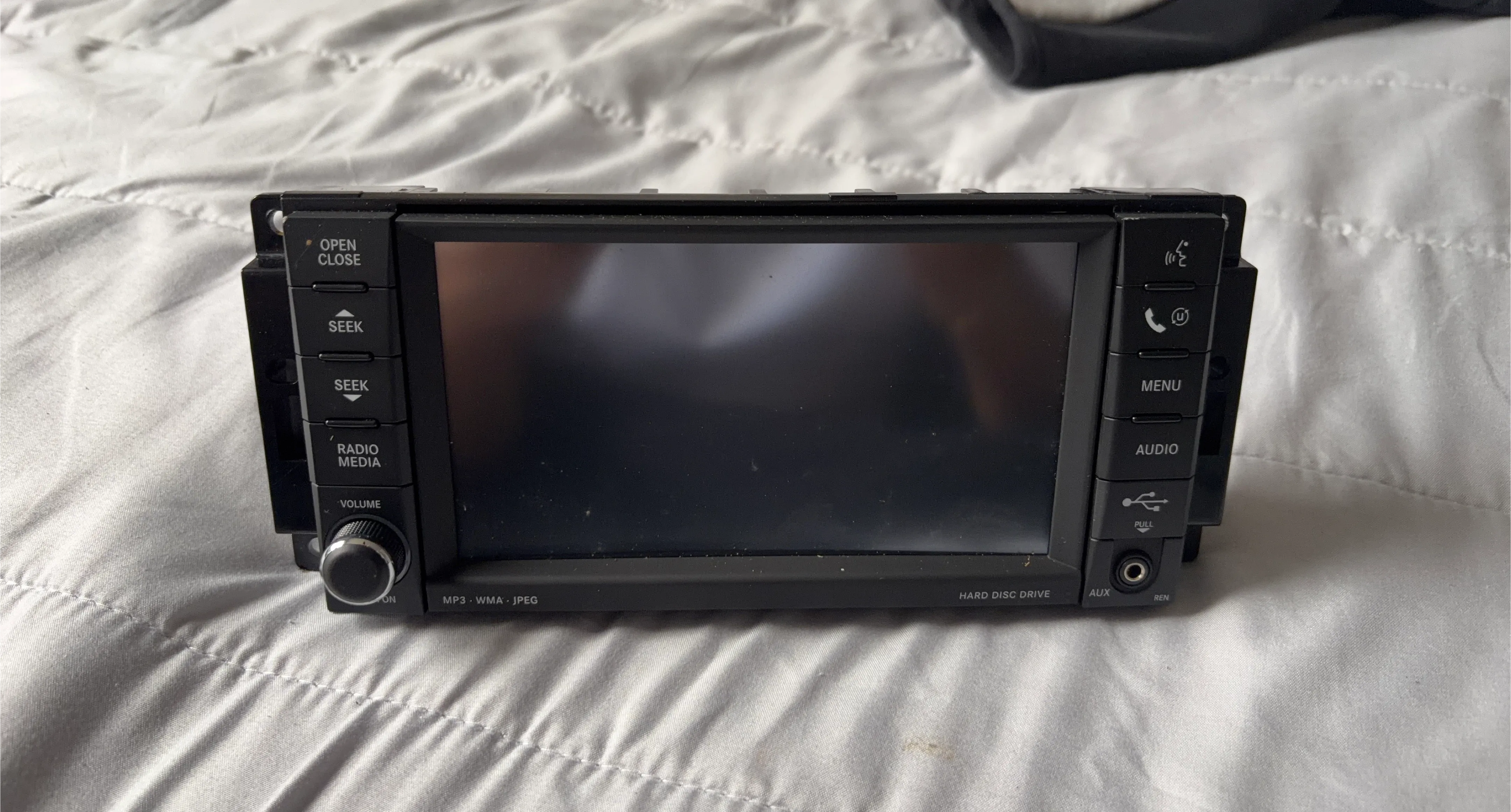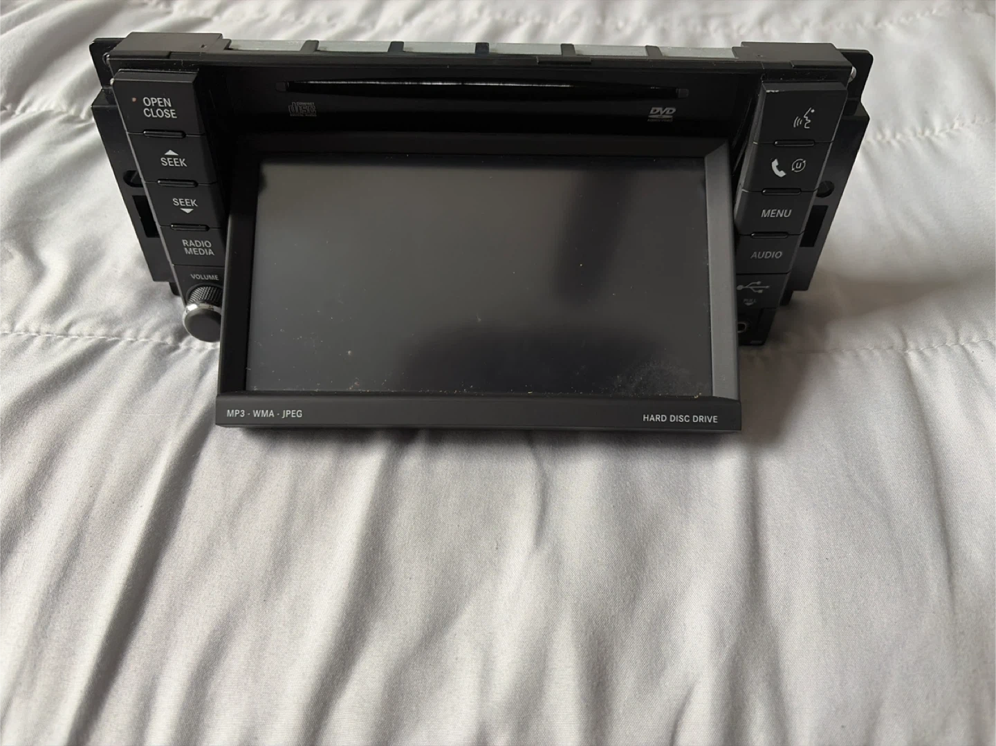 Car stereo radio with DVD player. Supports MP3, WMA, and JPEG formats. Includes AUX input and hard disc drive. Features AM/FM radio and media controls.