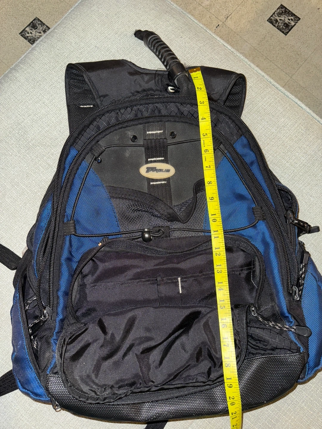 This Targus backpack is black and blue. It's approximately 19 inches tall. Multiple compartments offer ample storage. Constructed of durable nylon materials and a water-resistant base, this backpack will keep your gear protected and dry from the elements and everyday wear and tear