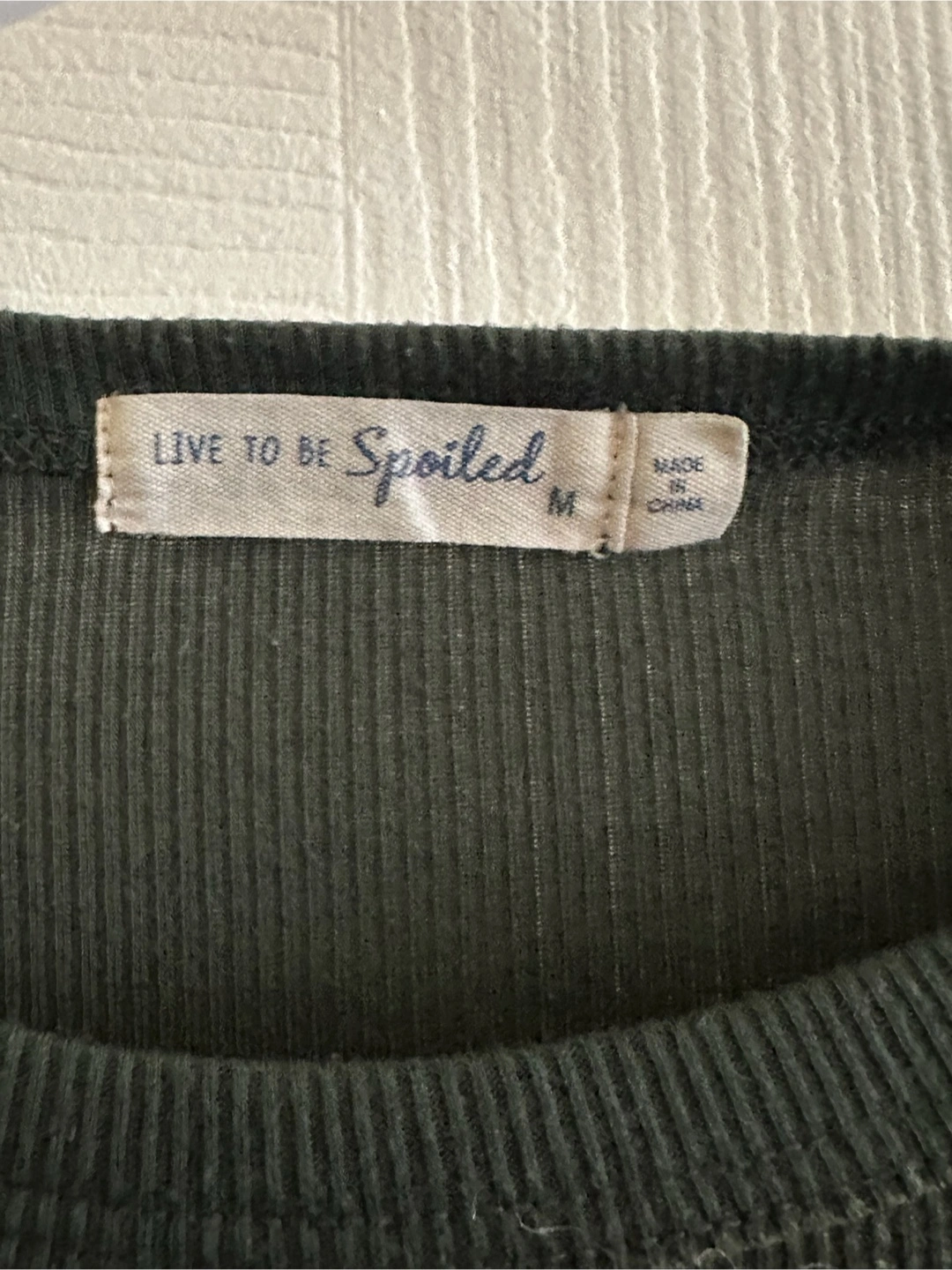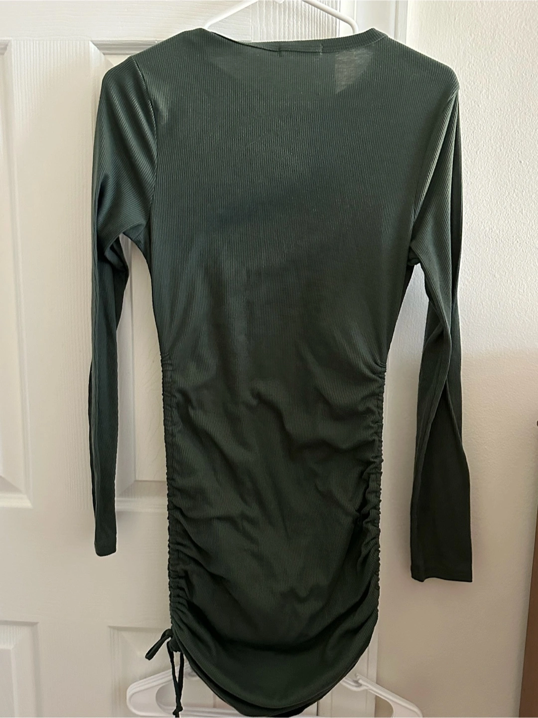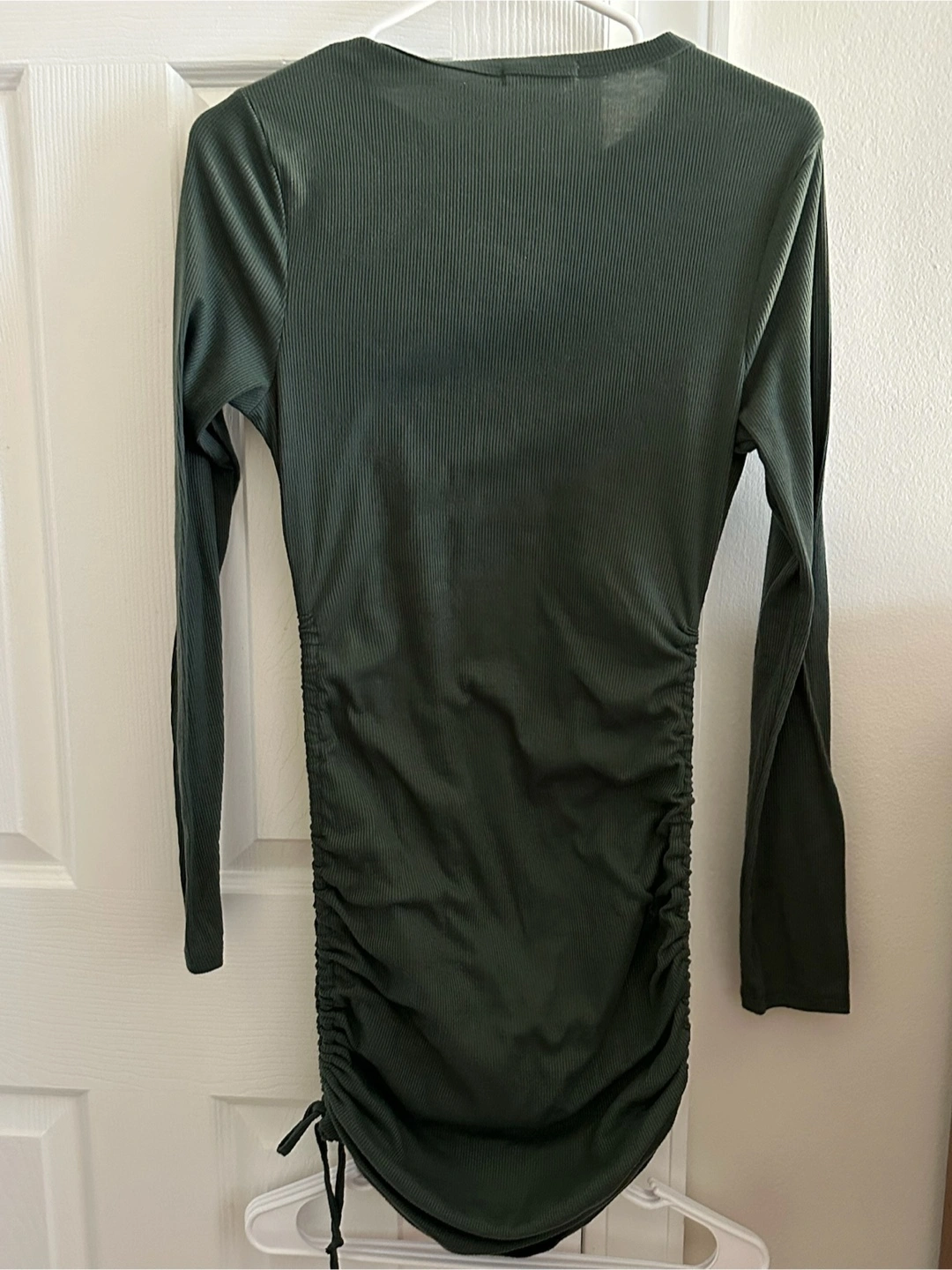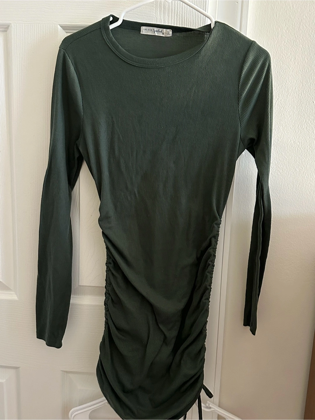 I'm selling an olive green dress from Live To Be Spoiled. It's a size medium and has a ribbed texture. It features a drawstring detail on the side, letting you adjust the length and fit. It's in great condition!