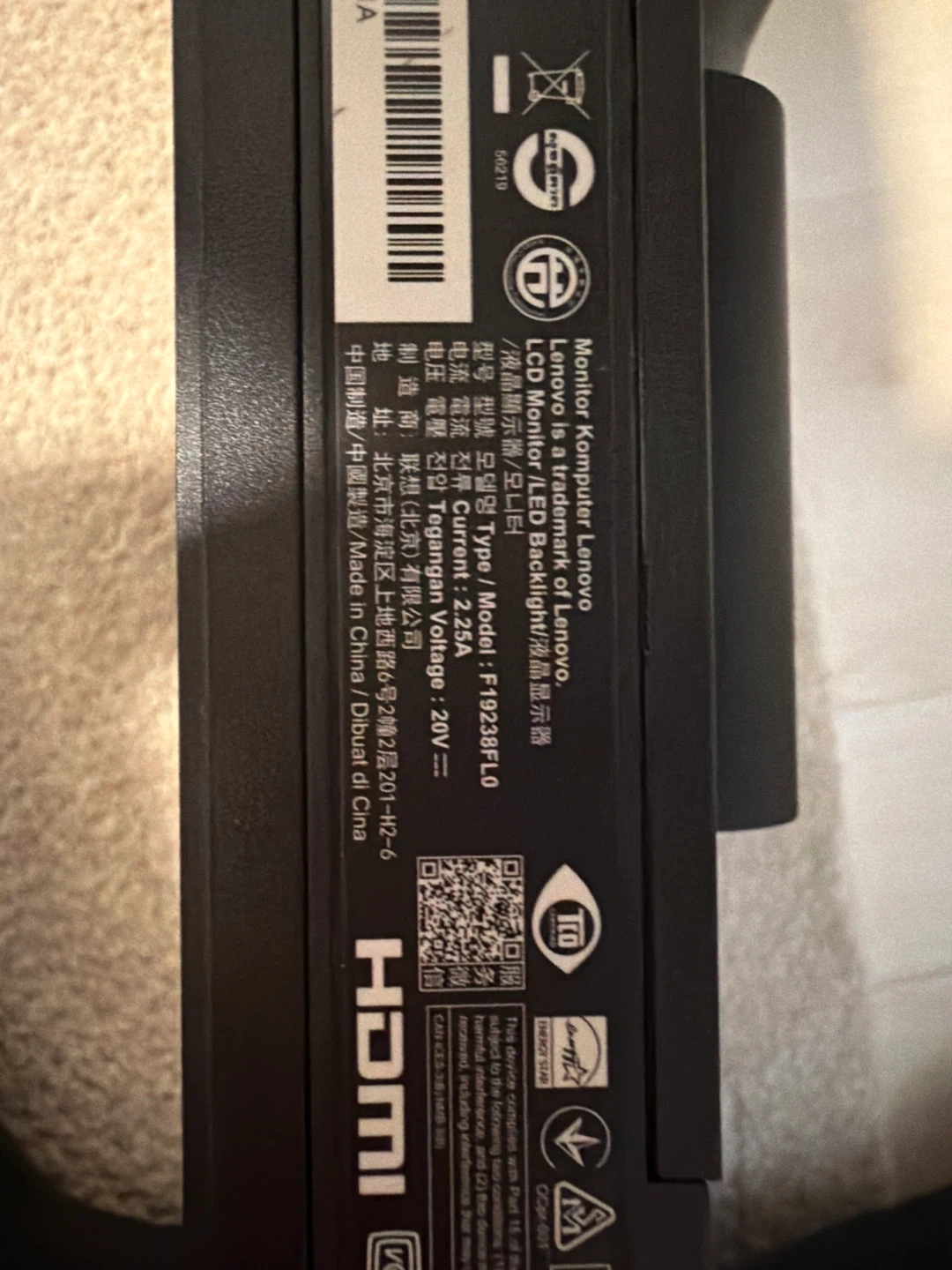 This is a Lenovo F19236FL0 LCD LED Backlight Monitor. It's a 20V monitor. It comes with HDMI, VGA, and USB ports.