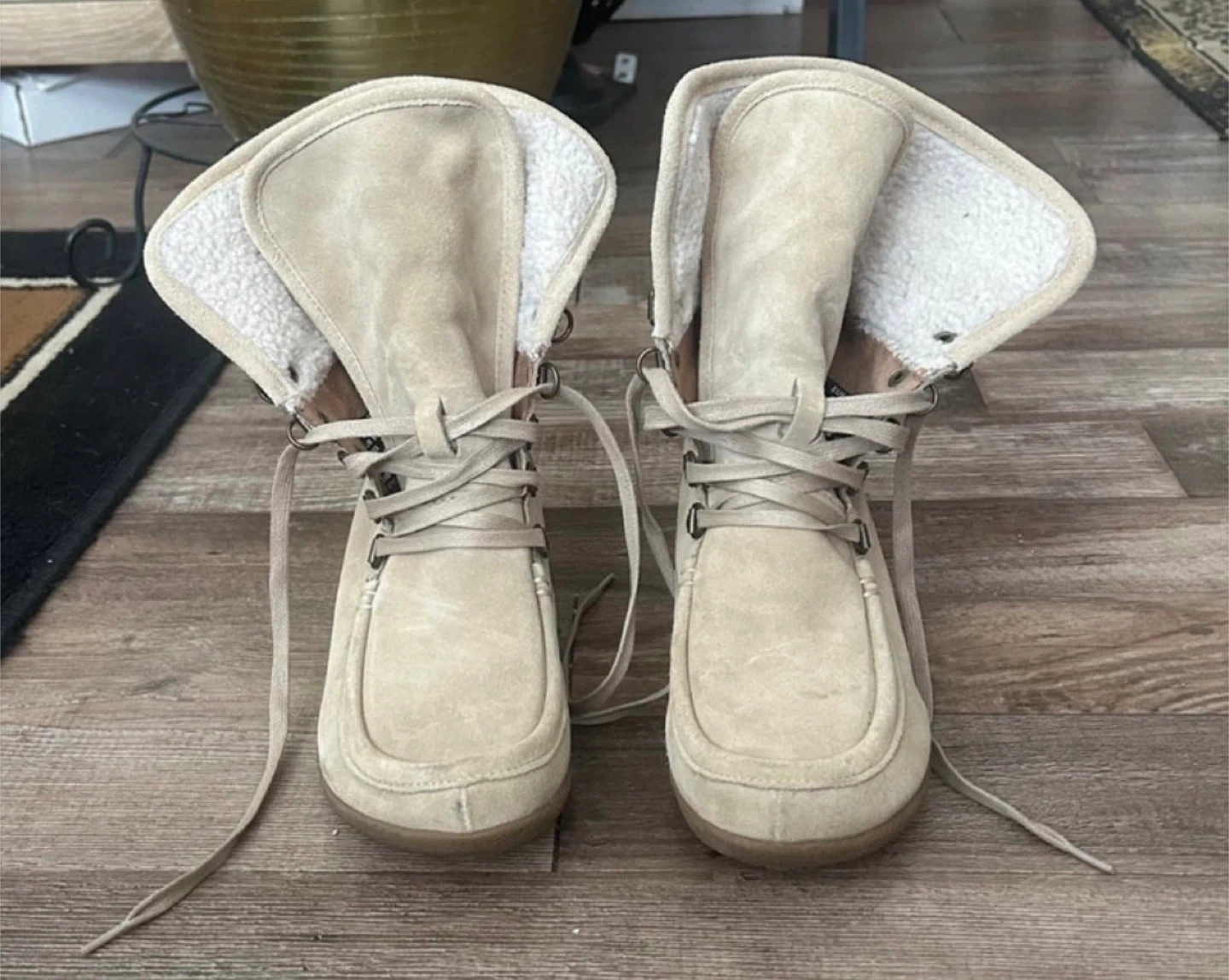 Comfy beige suede boots with a cozy faux fur lining. They're lace-up style with a rubber sole. Perfect for staying warm on chilly days! Still in excellent condition