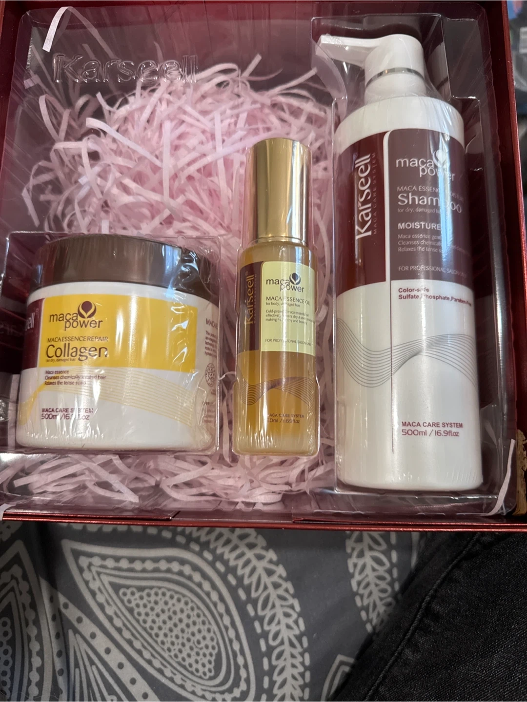 Selling a brand new Karseell Maca Power Repair Set! This set includes shampoo, essence oil, and collagen hair mask. Perfect for chemically treated or damaged hair, it gently cleanses and helps relax the scalp. The set contains: - Shampoo: 500ml - Essence Oil: 50ml - Collagen Hair Mask: 500ml