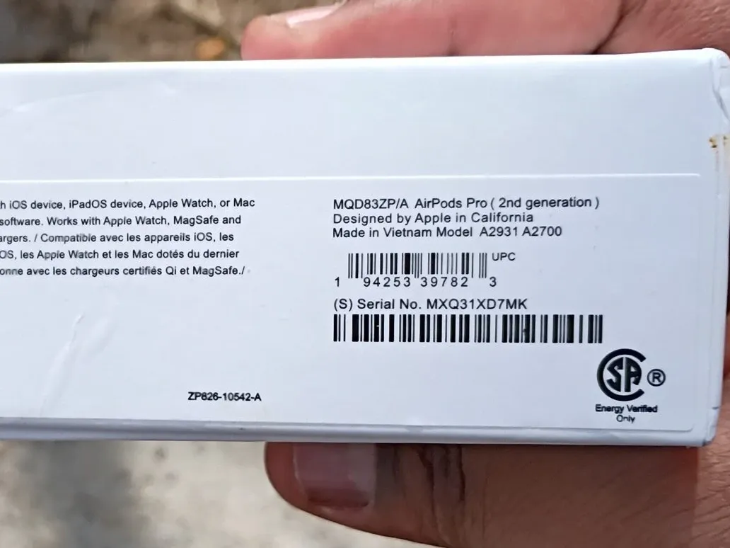 Apple AirPods Pro (2nd generation). MQD83ZP/A. Designed by Apple in California. Made in Vietnam.