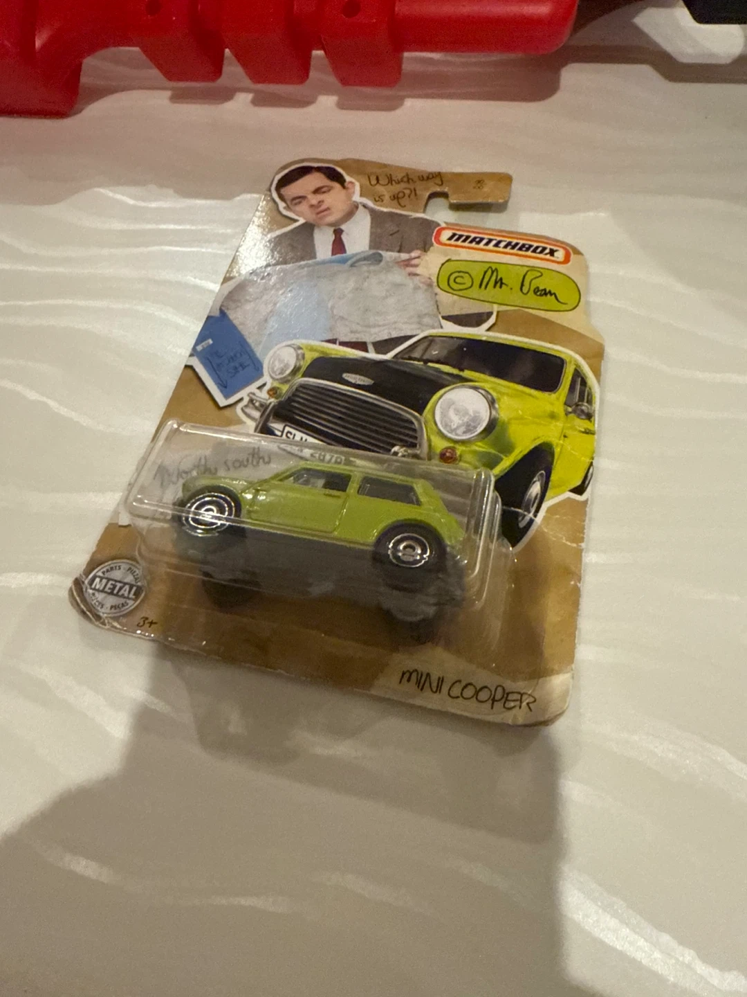 Matchbox collectible die-cast toy car featuring the Mini Cooper. This model is part of the Mr. Bean collection. Recommended for ages 3 and up. Metal construction.