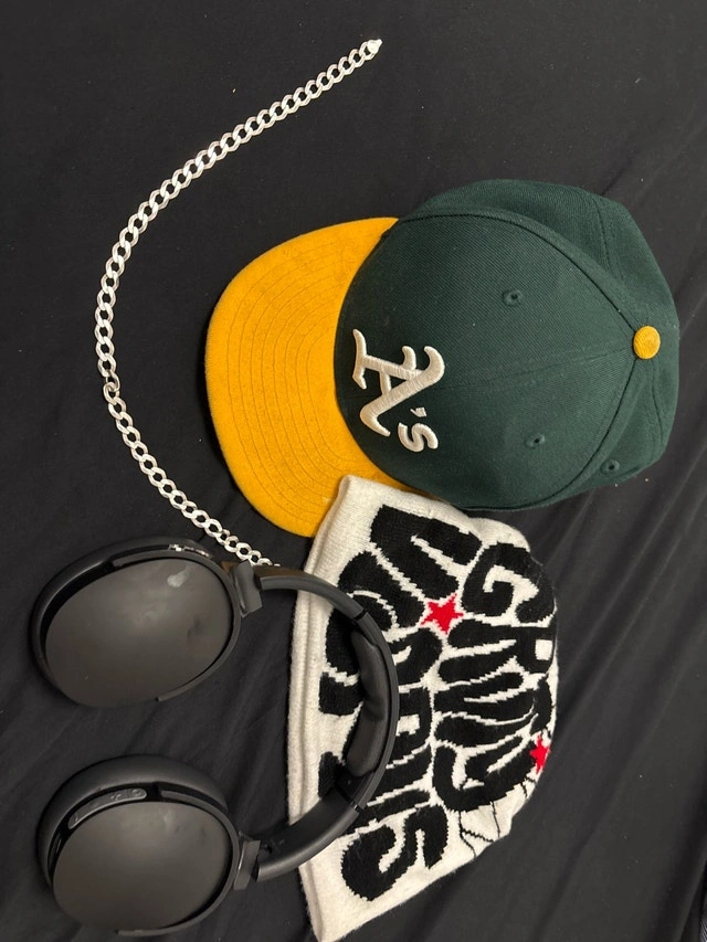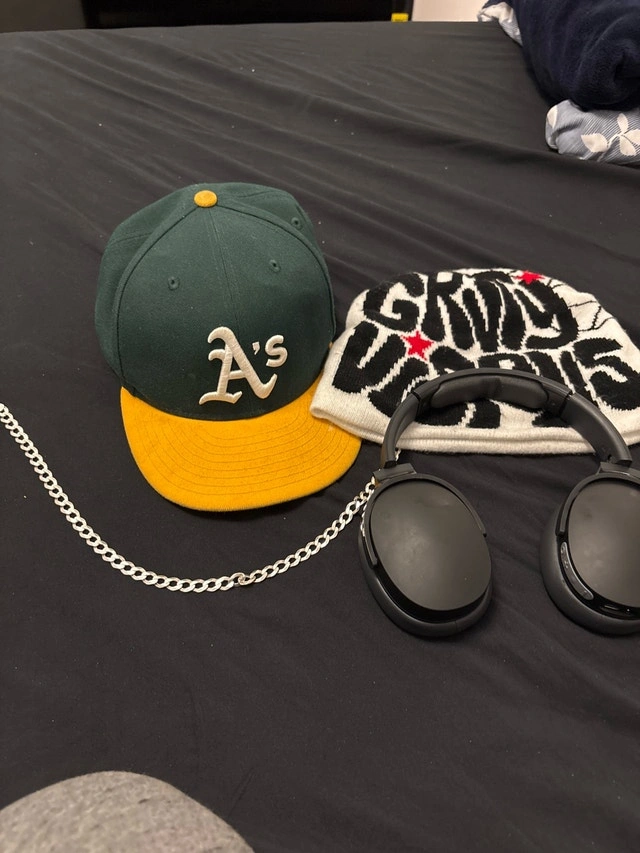 Selling a curated bundle of accessories in used condition. This collection features a stylish mix of items including an Oakland Athletics baseball cap with a vibrant yellow brim, a 'Grind' beanie, and a set of wireless headphones. Each piece has its own unique flair, perfect for adding character to your look or enjoying your favourite tunes on the go. Includes: Oakland Athletics baseball cap, 'Grind' beanie, Wireless headphones, Real silver necklace. If the ad's still up, it's available!