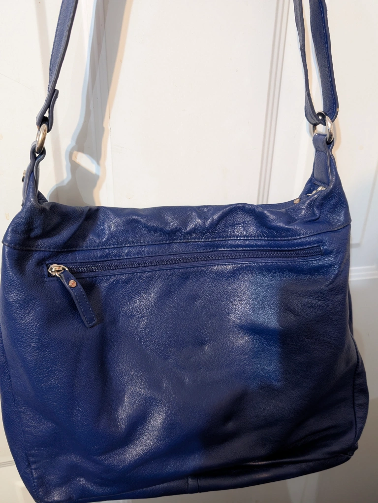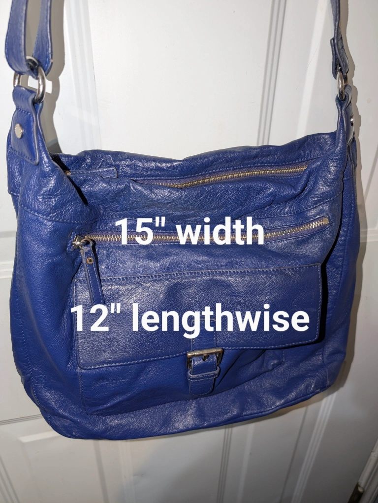 Here's a stylish blue genuine Danier leather shoulder bag that's ready for a new home! It measures approximately 15 inches in width and 12 inches lengthwise, making it a great everyday bag