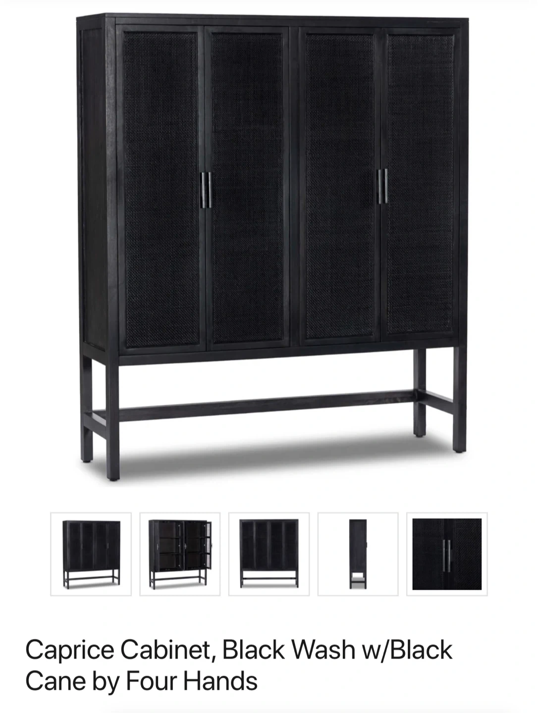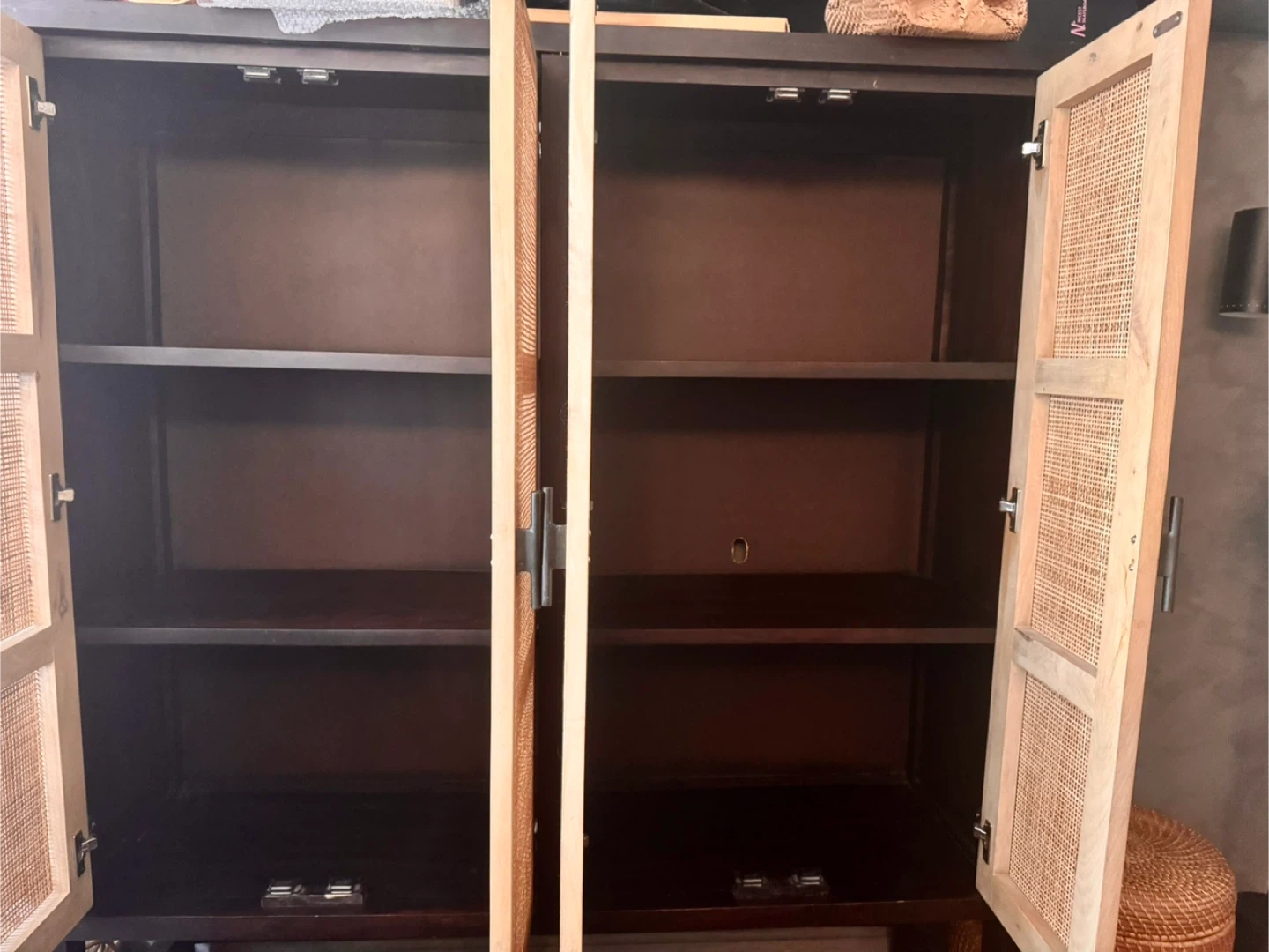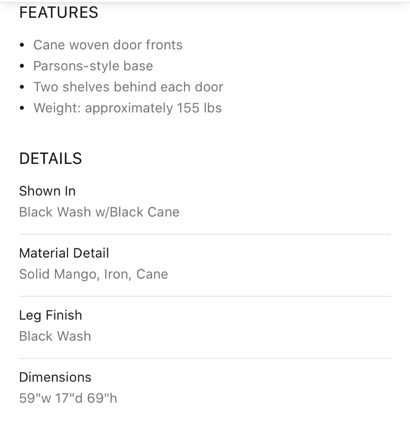 This cabinet features cane woven door fronts and a Parsons-style base. It has two shelves behind each door. Made with solid mango, iron, and cane. Dimensions: 59"w 17"d 69"h.