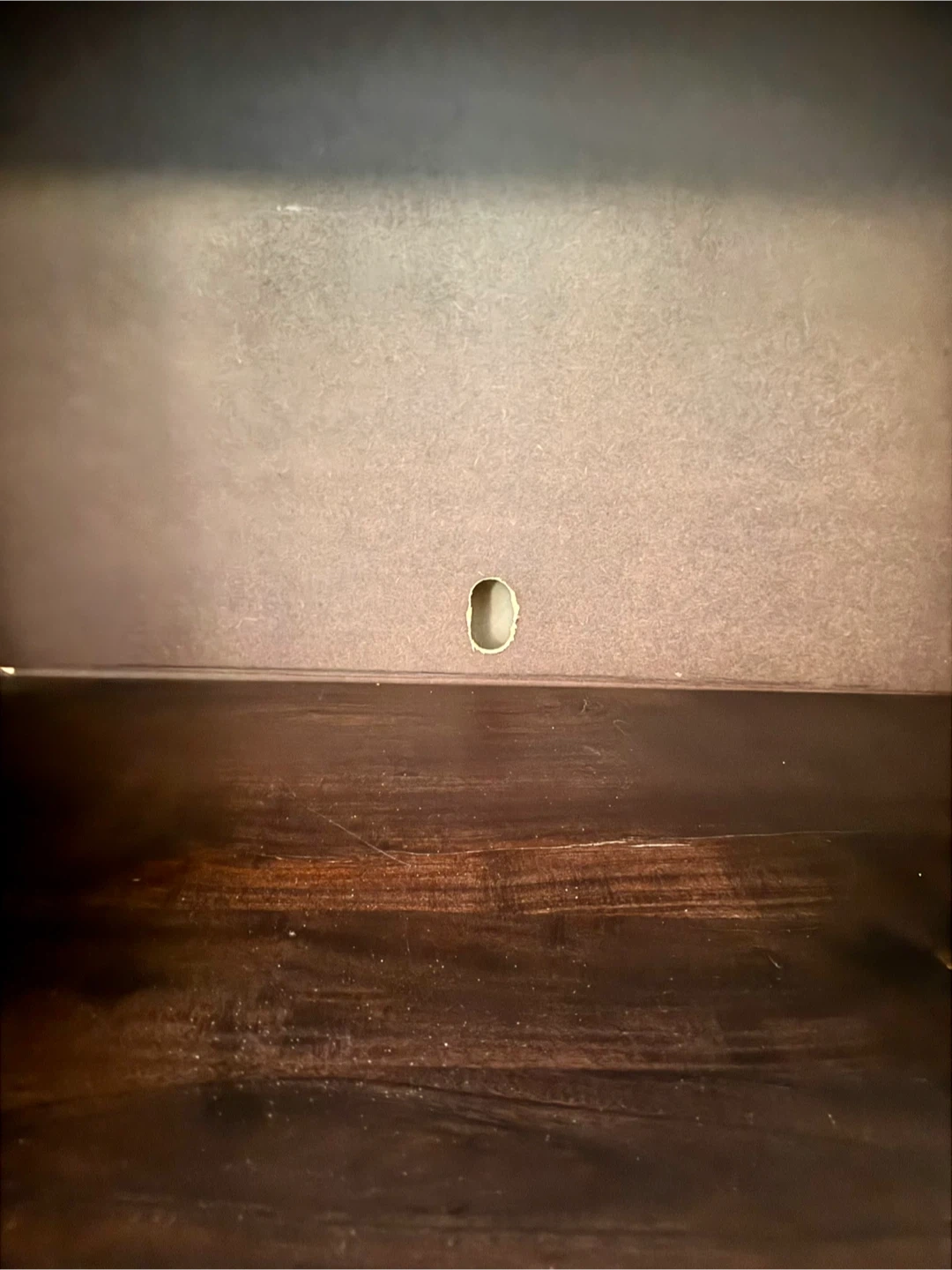 The cabinet has a hole carved out (not professionally) for wires. There is also a separation in the middle top of the cabinet (shown in the last picture) that can be fixed by someone who knows what they’re doing.