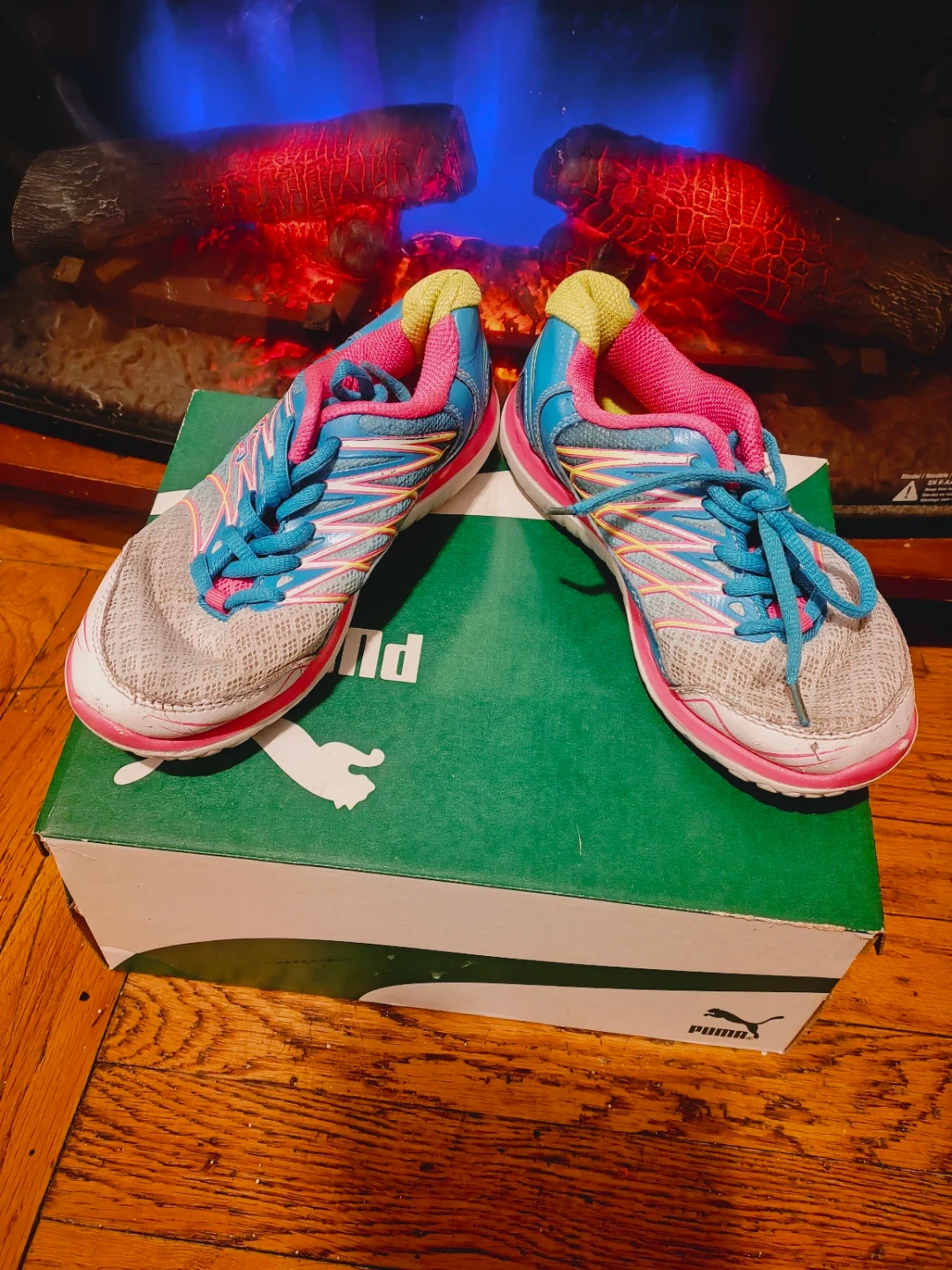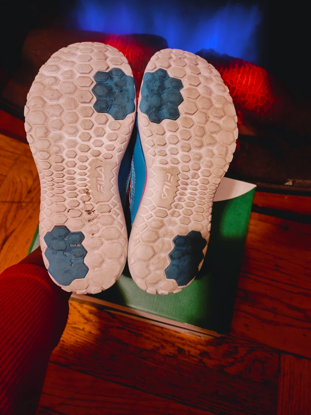 These Fila running shoes are a youth size 2.5. They're made with a leather and synthetic upper and a rubber and EVA sole. Includes original box!