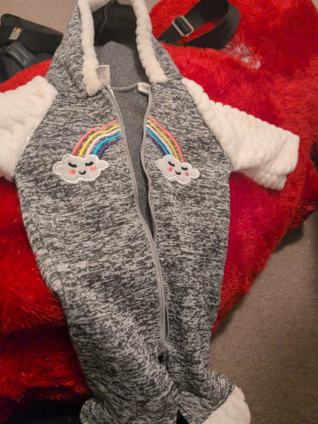 Cozy grey sleepsuit with white textured sleeves and trim. Features two embroidered rainbow and cloud appliques. Zipper front closure for easy dressing. Perfect for keeping your little one warm and snug!