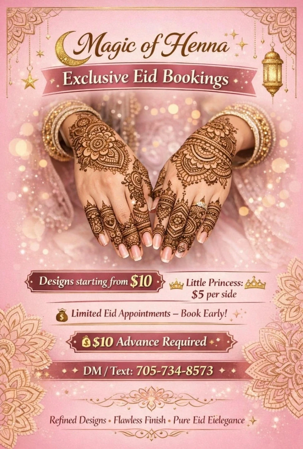Magic of Henna is offering exclusive Eid bookings! Designs start from $10, with a Little Princess option for $5 per side. Limited appointments are available, so book early! A $10 advance is required.