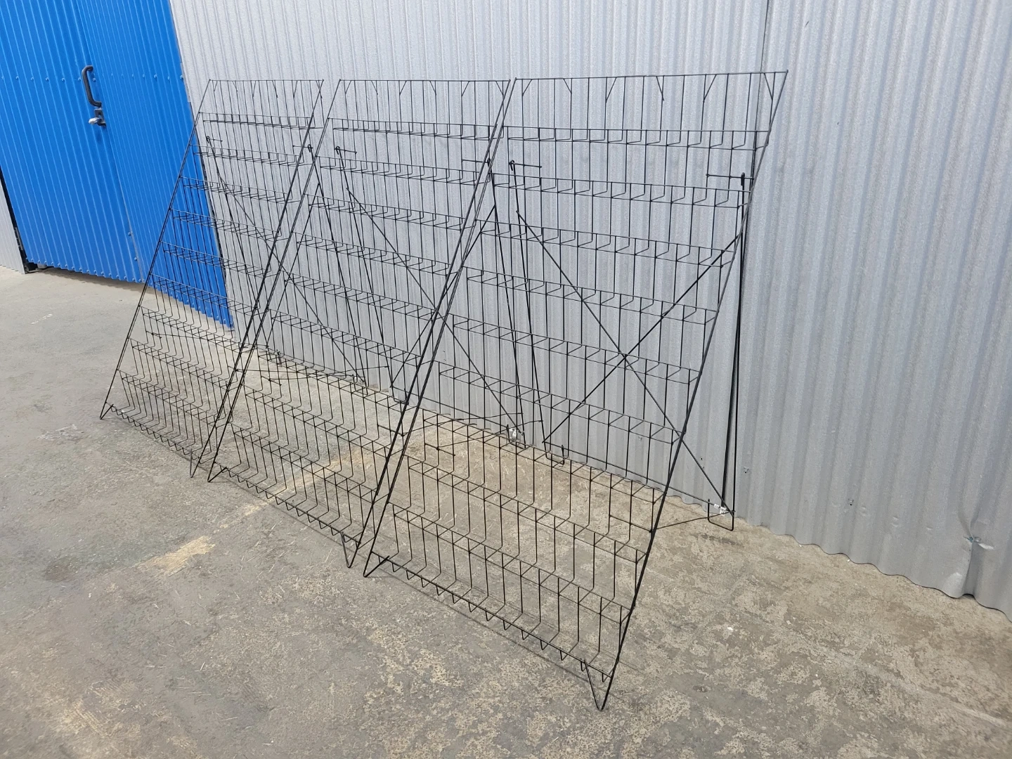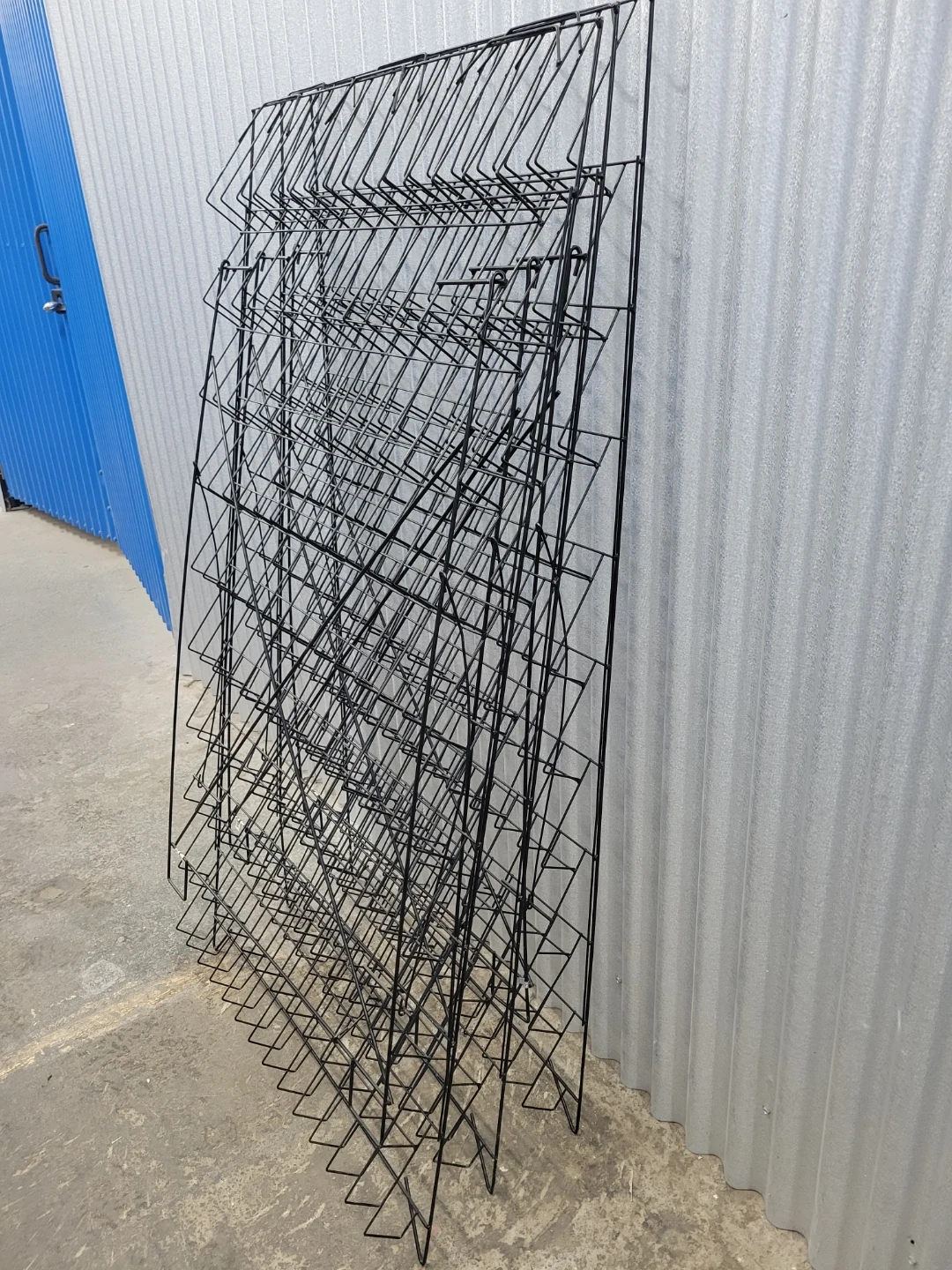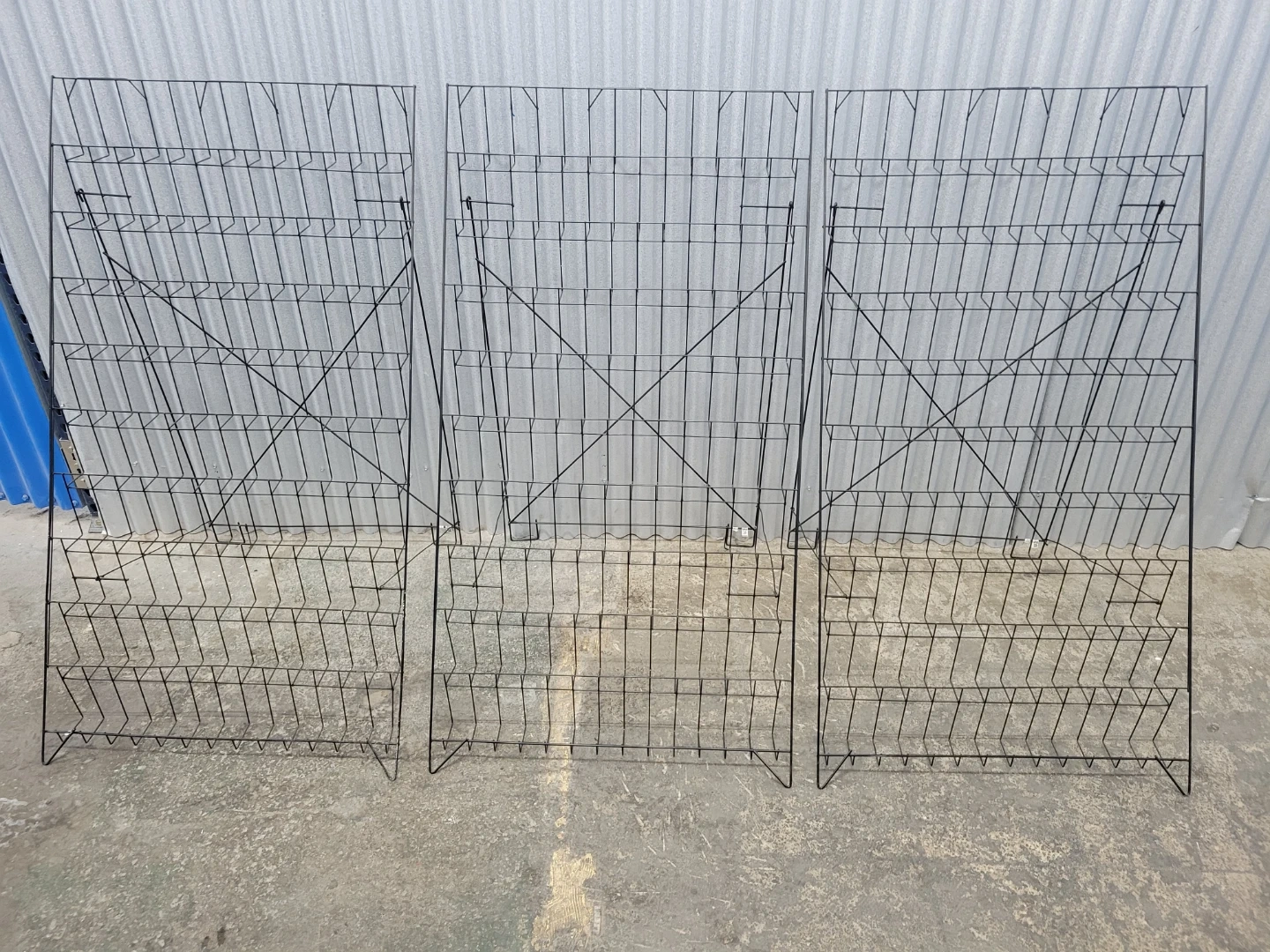 This is a black wire display rack with three sections. Each section has multiple shelves. It's great for retail or event displays! Wire construction.