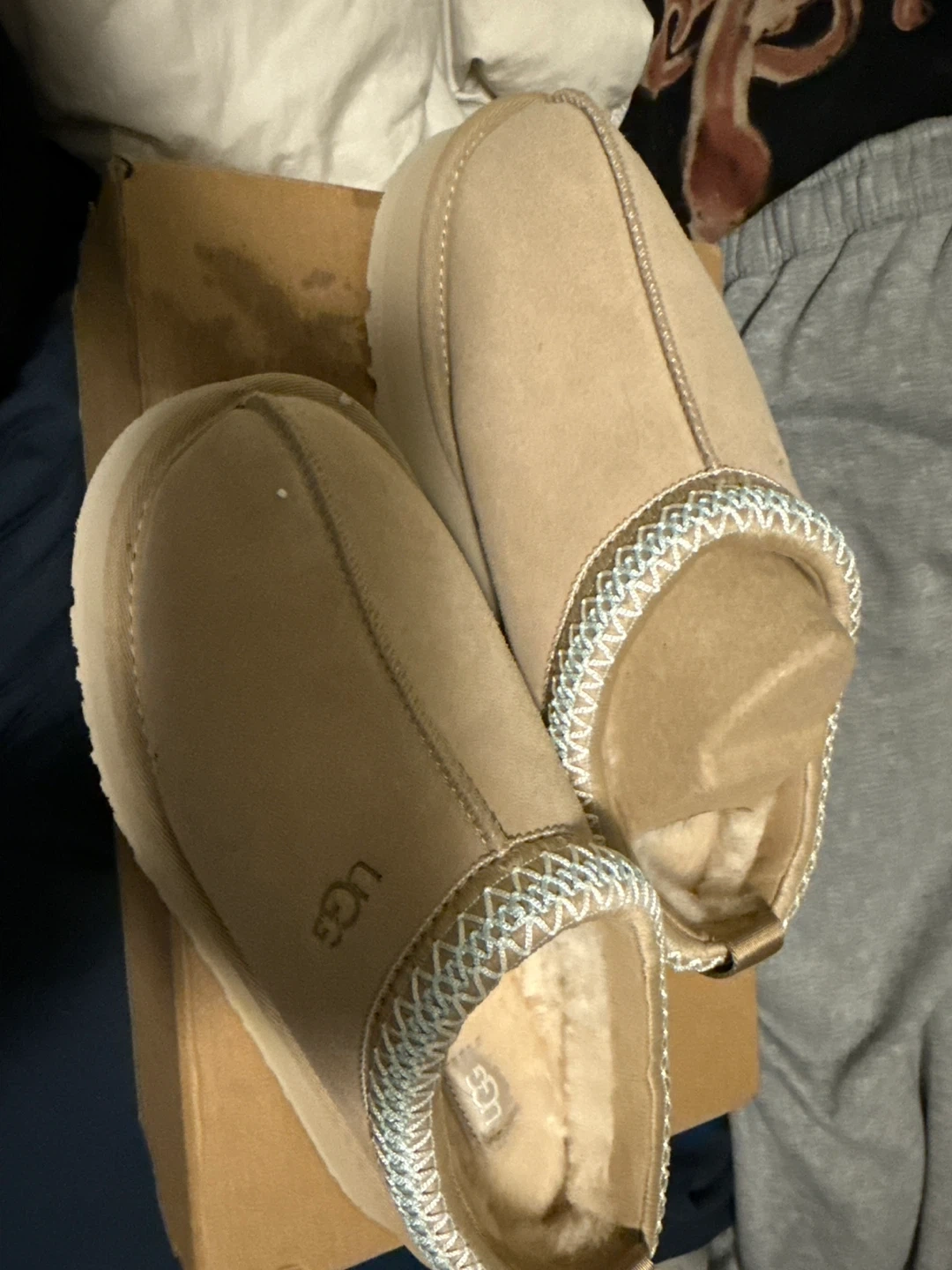 Selling a pair of UGG Women's Tasman slippers in size 7. They're brand new never worn! The slippers are a cozy beige colour and perfect for indoor or outdoor wear. These feature a suede upper and a warm sheepskin lining for ultimate comfort