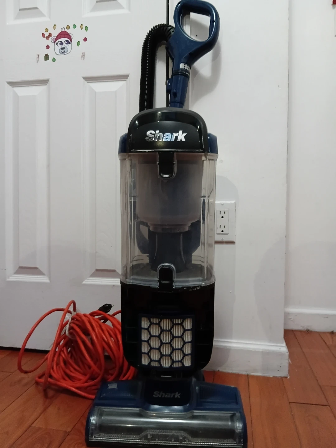 This is a Shark upright vacuum cleaner. It's blue and black with a clear dustbin. Includes power cord. Perfect for cleaning floors!