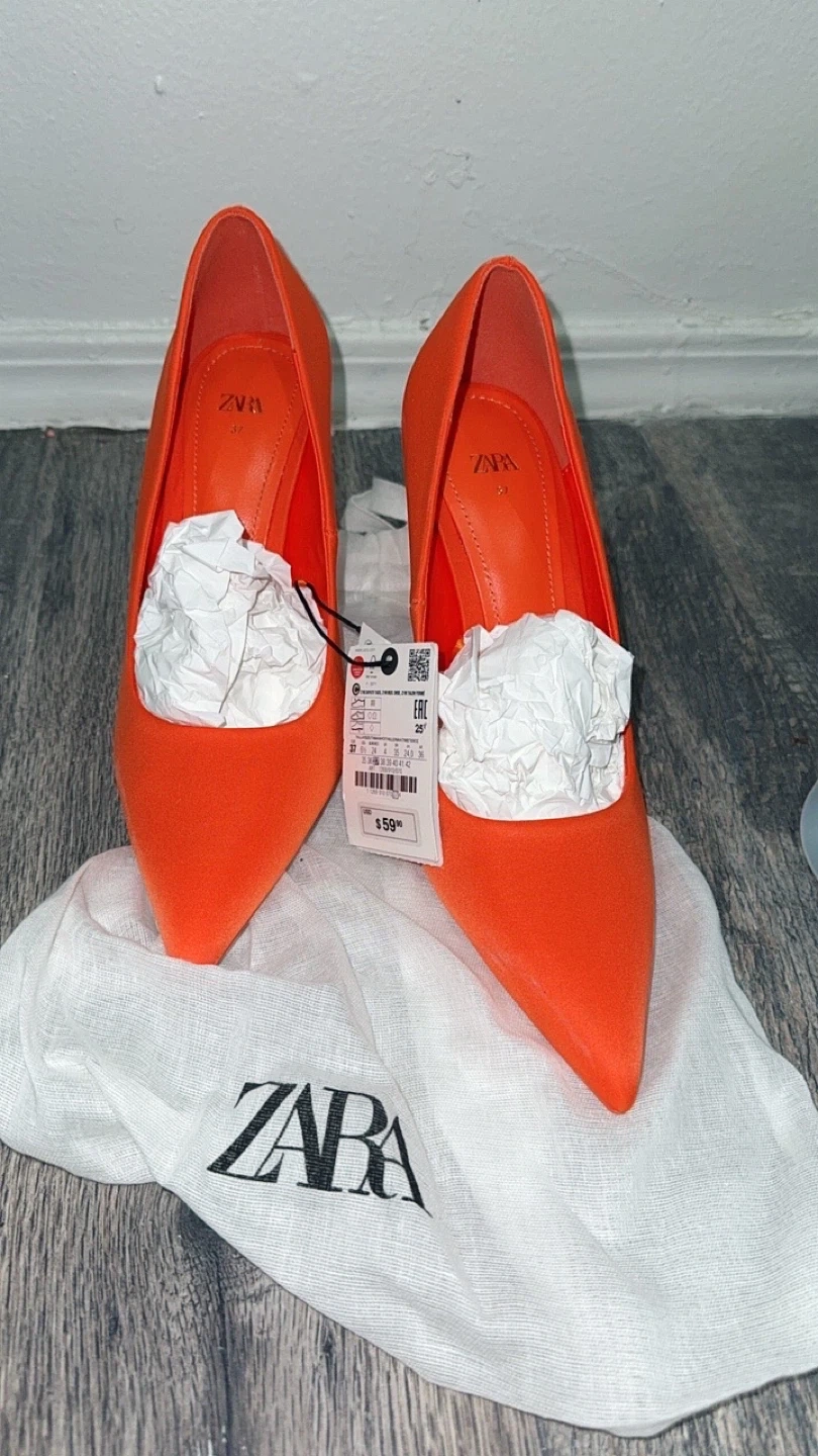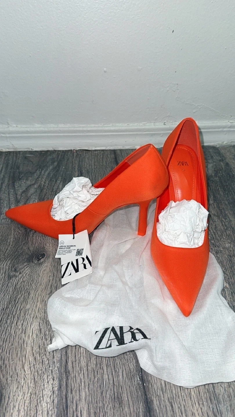 These Zara women's heels feature a vibrant orange color and a classic pointed toe design. They come with a dust bag for storage. Perfect for adding a pop of color to any outfit!