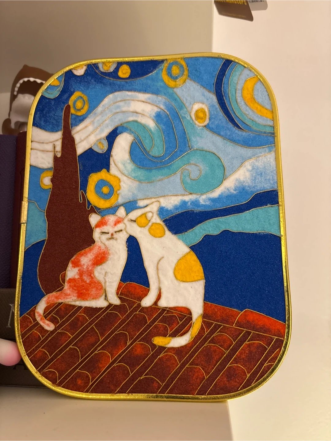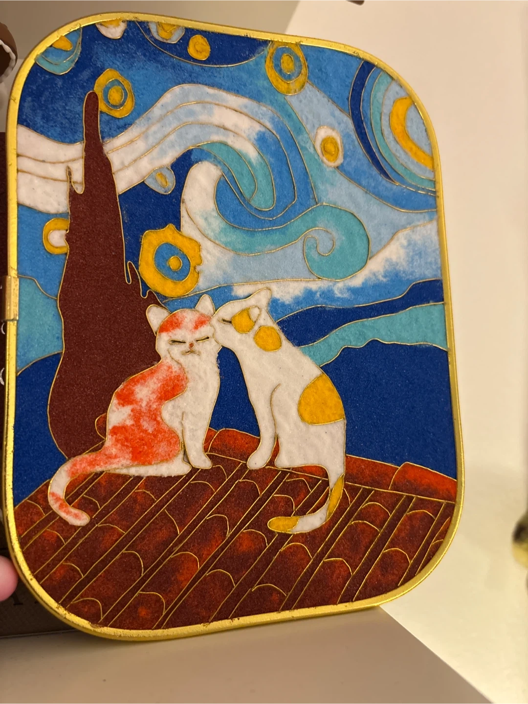 This decorative framed sand painting features a charming "Starry Night" inspired design with two cats. It's a unique piece for decoration - I made this a while back , it’s made out of cloisonné art 8x 6 inch
