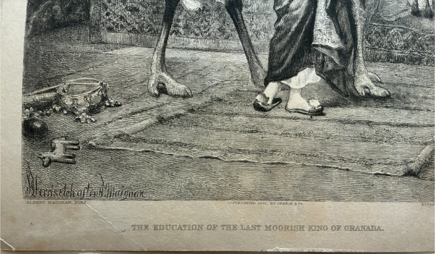 The image is a print, likely an etching or engraving, titled "The Education of the Last Moorish King of Granada". It is based on a painting by the French artist Albert Maignan