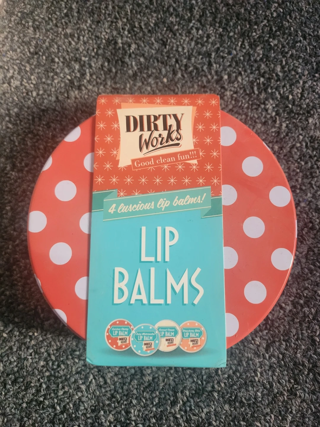 This set includes four luscious lip balms from Dirty Works. Flavours include Luscious Cherry, Fruity Strawberry, Coconut Cream and very Berry Swirl. This is a brand that is not easy to come across. The lip balms come in a cute polka dot tin!