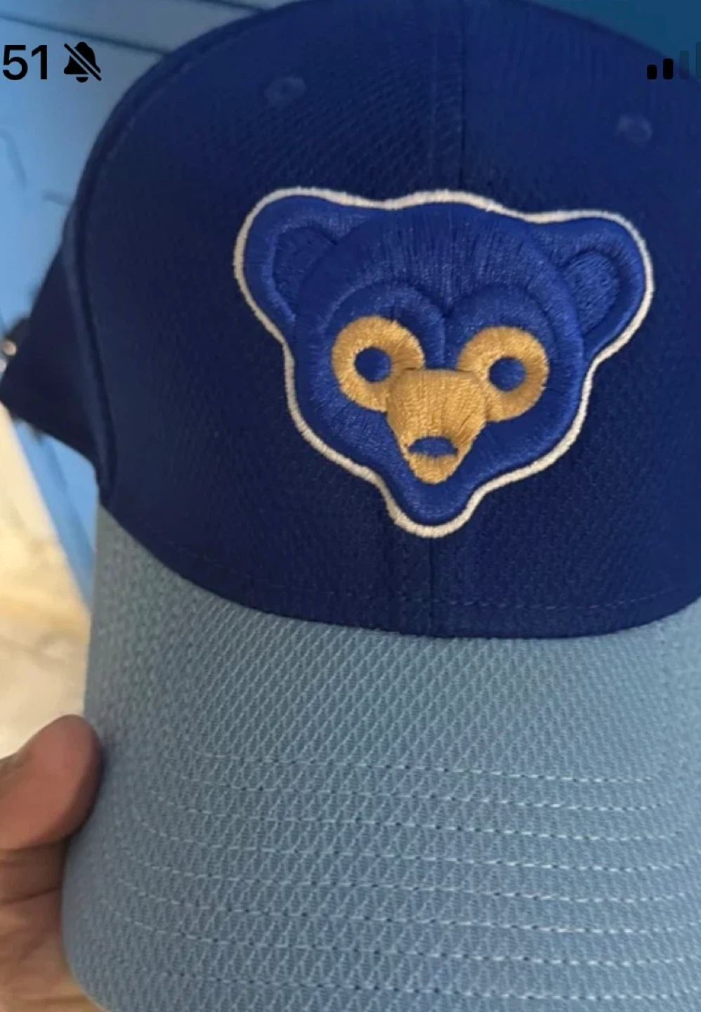 This is a Chicago Cubs baseball cap. It's blue with a light blue brim. The cap features the team's bear logo embroidered on the front.