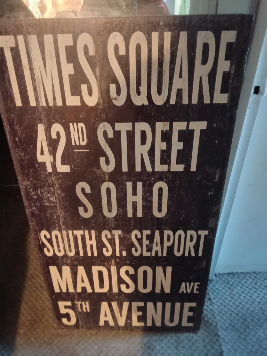 This sign displays several iconic New York City locations like Times Square, Soho, and 5th Avenue. It's designed to look like a vintage street sign. This would be a cool decorative piece for any home or office!