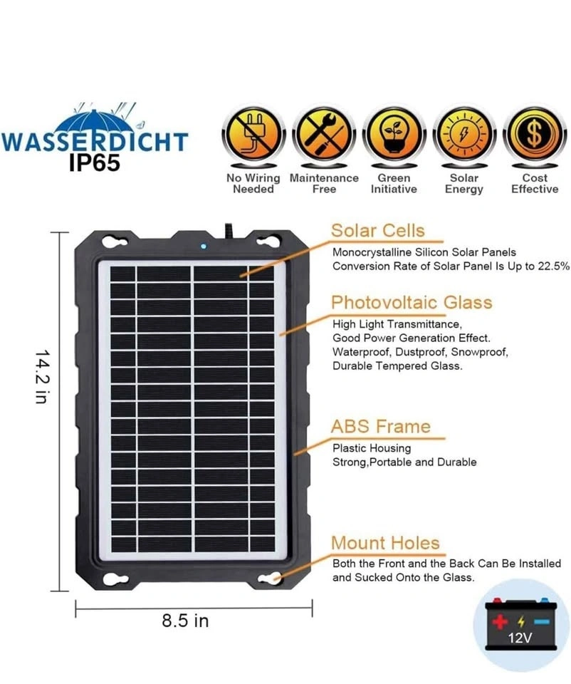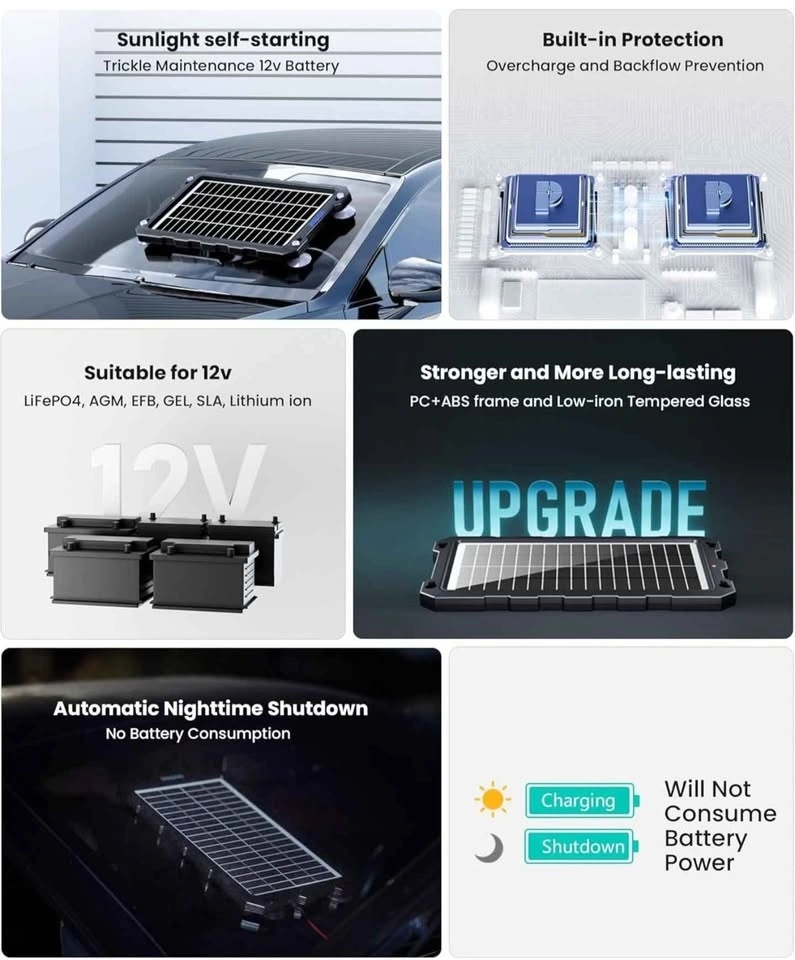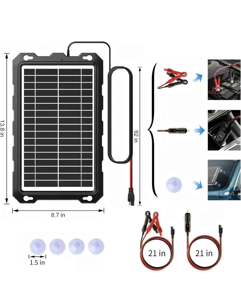 Keep your 12V batteries topped up with this portable and waterproof solar trickle charger. Great for cars, motorcycles, boats, RVs, and more. It's designed to maintain your battery's charge, preventing it from draining when not in use.