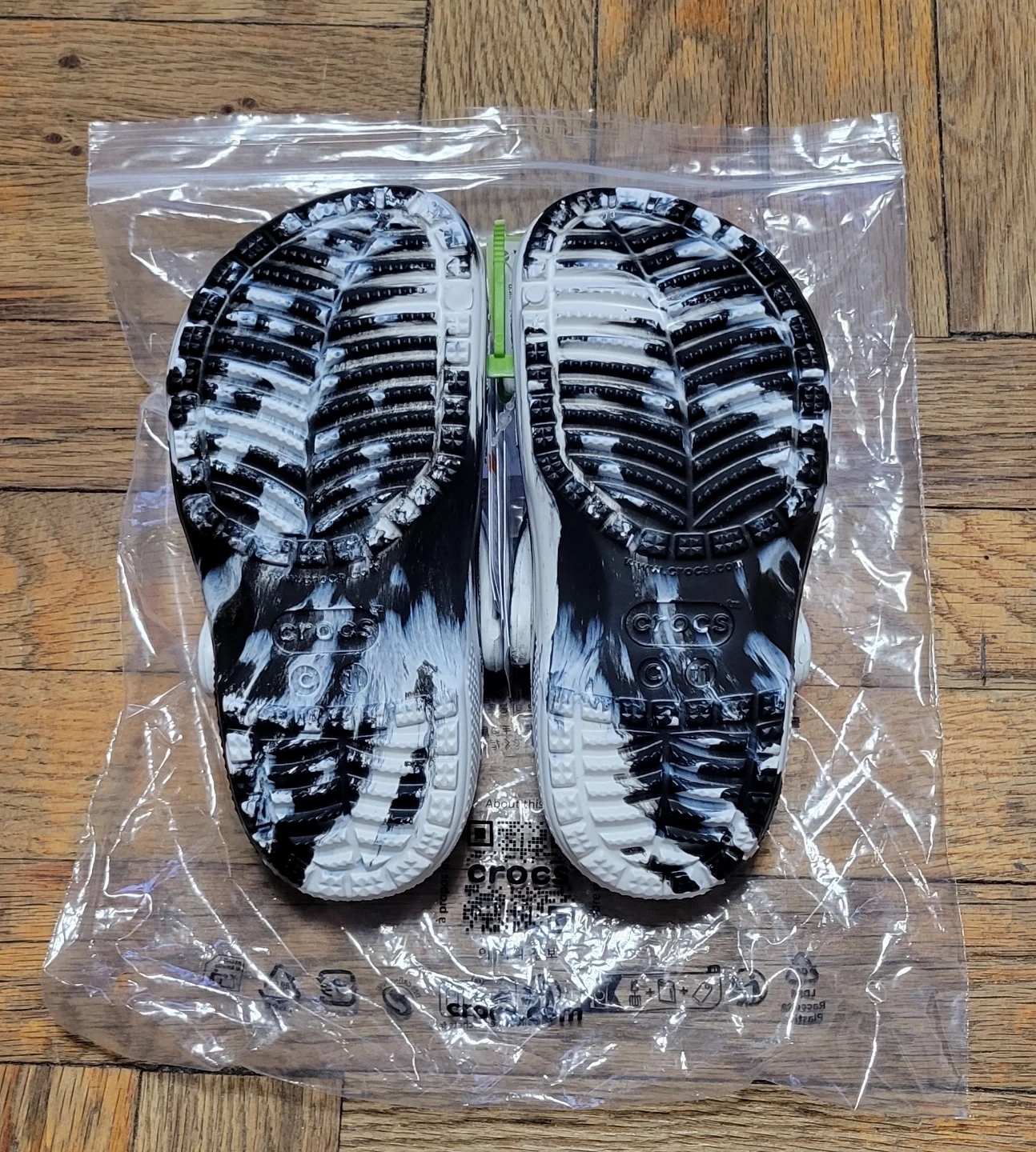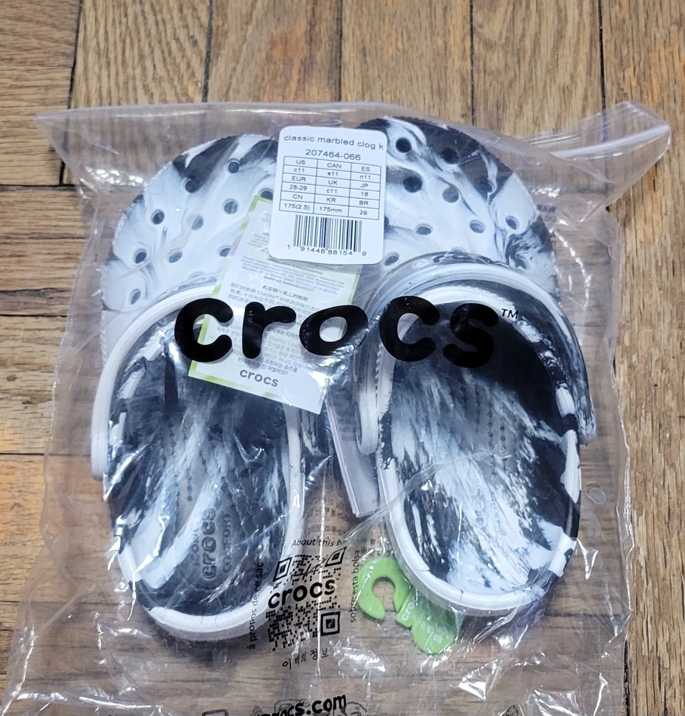 Classic marbled clog K in size C11. These clogs are made from Croslite material. They feature a marbled black and white design.